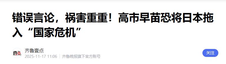 错误言论,祸害重重!高市早苗恐将日本拖入“国家危机”——齐鲁壹点