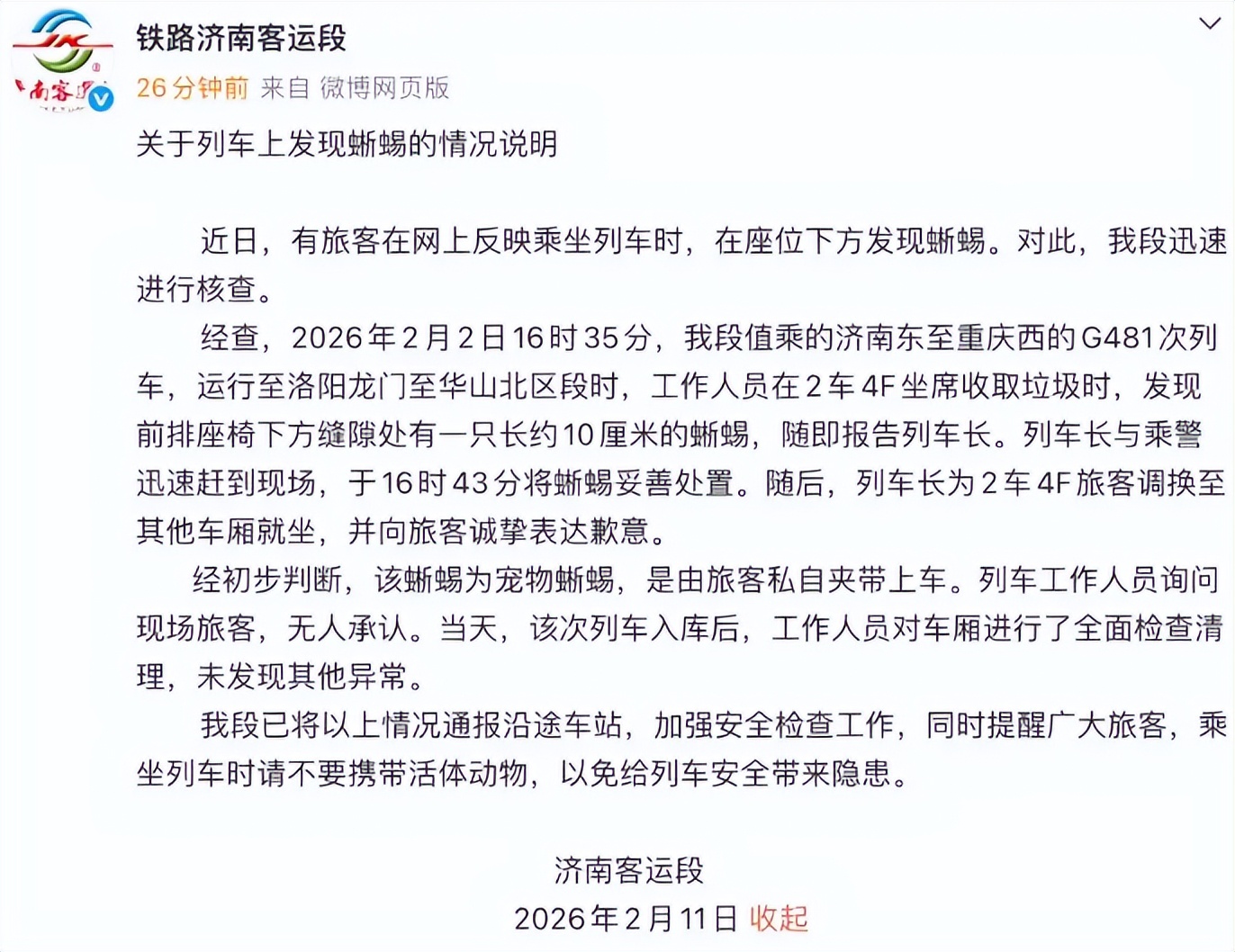 2月11日,铁路济南客运段发了官方通报:蜥蜴是旅客私自夹带上车的宠物,现场询问时,没有一个人承认。