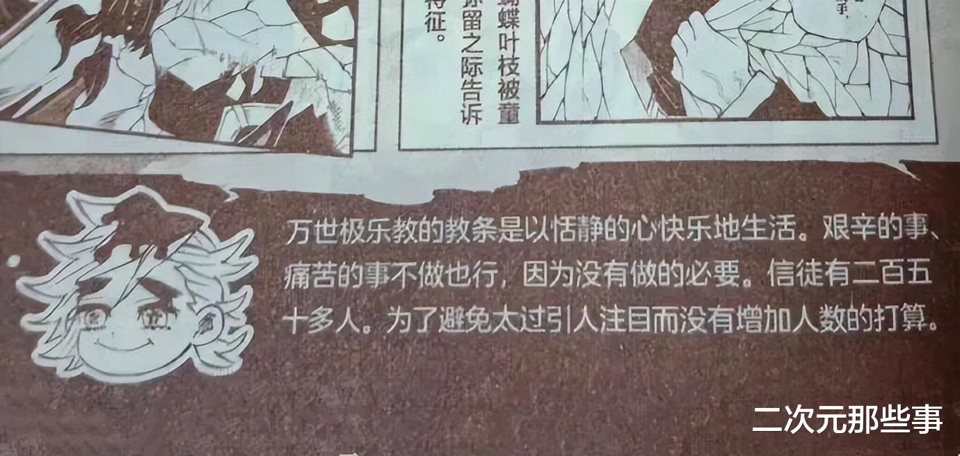 在这种惨绝人寰的环境下,童磨的“万世极乐教”简直是世外桃源,不但包吃包住,而且教祖童磨还会时不时的开导成员,就连教义也是非常正能量,抱有沉稳的态度去开心过生活,让人难受或是痛苦的事,没必要勉强自己去做。