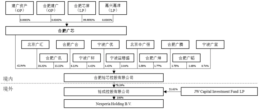 合肥芯屏持有的合肥广芯493,664.630649万元人民币财产份额,合肥广芯持有合肥裕芯42.94%的股权,合肥裕芯间接持有裕成控股78.39%的股份,裕成控股持有安世集团100%的股份,安世集团持有安世半导体100%的股份。