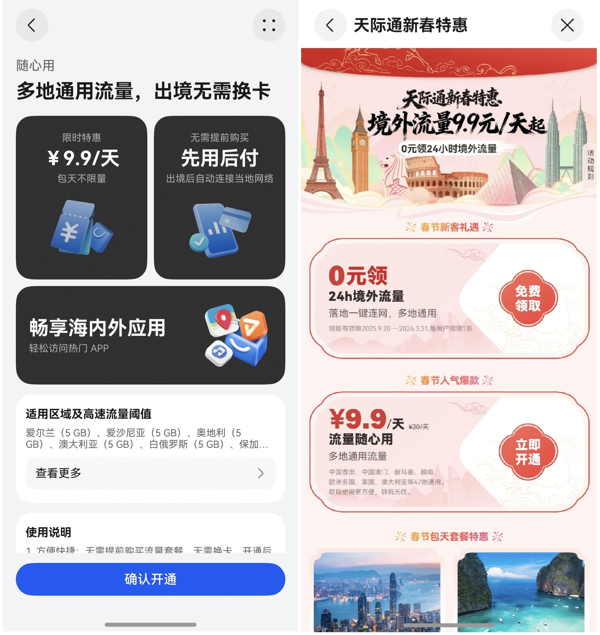 春节如果计划出国玩,还有一个让人头疼的事儿就是流量问题。往年不是换电话卡就是开通漫游,信号还时好时坏。看着视频里的小马姐姐拖着行李箱走遍世界,头顶的信号始终满格,瞬间种草华为天际通,不用换卡等繁琐步骤,也不用复杂设置,App买好流量,落地就能联网,信号满格。现在还可以0元领24小时境外流量,落地先应个急手拿把掐。此外还有9.9元多地流量随心用,流量管够,50多个国家和地区流量全通用,还能共享给同行的家人一起用,在国外刷个YouTube视频、发个朋友圈、查个攻略啥的主打一个方便。相比以前的各种“人在囧途”,现在有天际通这一上网神器,出门底气直接拉满。