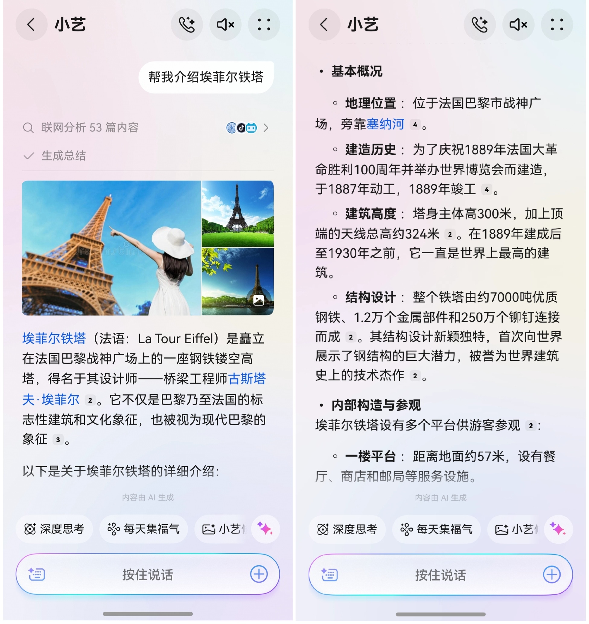 在外游玩,最怕的就是走马观花,兜兜转转还是一问三不知。视频里的小马哥哥就很聪明,在罗马斗兽场直接让小艺帮忙介绍斗兽场的历史,就像随身带了私人向导一样。我也让小艺帮忙介绍埃菲尔铁塔,小艺不仅给出了图片,还有地理位置、建造历史、建筑高度等背景信息,那叫一个详细。拍完照片,还能一句话让小艺修图,消除路人、加新年氛围、换背景等通通拿捏,拉满过年仪式感。