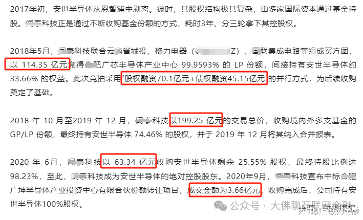 2018年,WT以超114亿的价格竞得该半导体公司33.66%的股权,资金来源包括股权融资的70亿,以及债权融资的45亿。