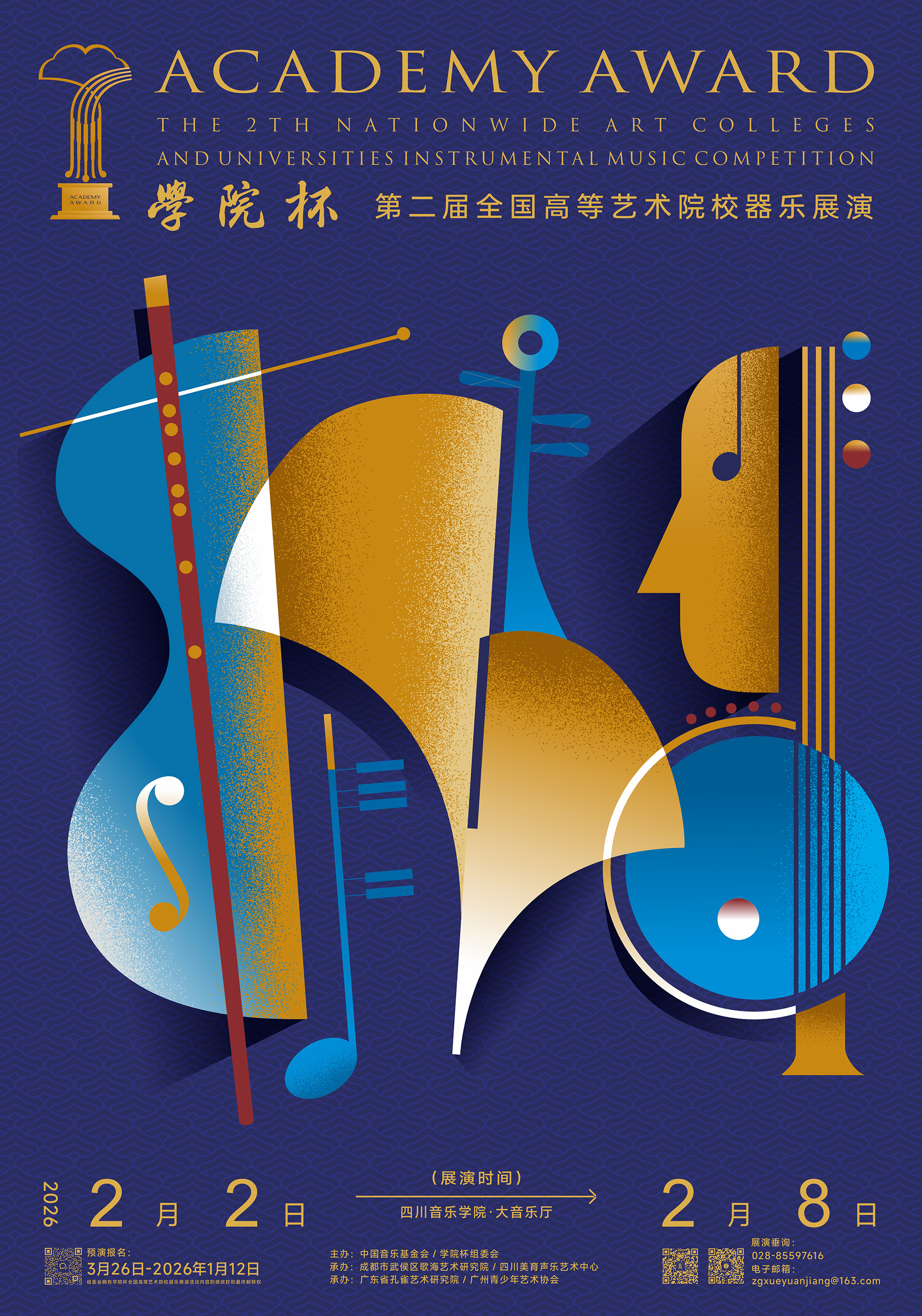 经主管部门批准备案,由中国音乐基金会、学院杯组委会主办,成都市武侯区歌海艺术研究院、四川美育声乐艺术中心、广东省孔雀艺术研究院、广州青少年艺术协会承办的“2025第二届学院杯全国高等艺术院校器乐展演暨首届全国高校器乐教学交流活动”定于2026年2月2日至2月8日在四川音乐学院大音乐厅举行。