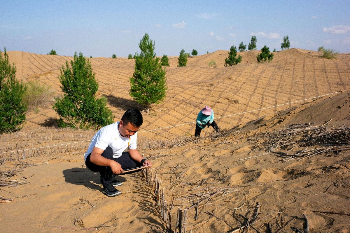 在狂风肆虐、烈日暴晒的荒漠里,治沙人顶着风沙一步步劳作,日复一日、年复一年,用双手编织出一道又一道绿色锁边,把肆虐的沙漠牢牢锁住。