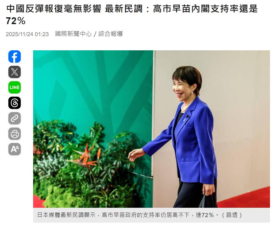 自由时报 2025-11-24——中國反彈報復毫無影響 最新民調:高市早苗內閣支持率還是72%