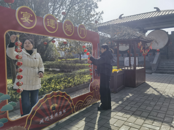 红色灯笼缀满古树枝丫,写有祝福语的彩条随风轻舞,花坛里花朵簇拥成团争相绽放……节日前夕的西安市临潼区鸿门宴博物馆,新春的气息和生机尽数铺展。