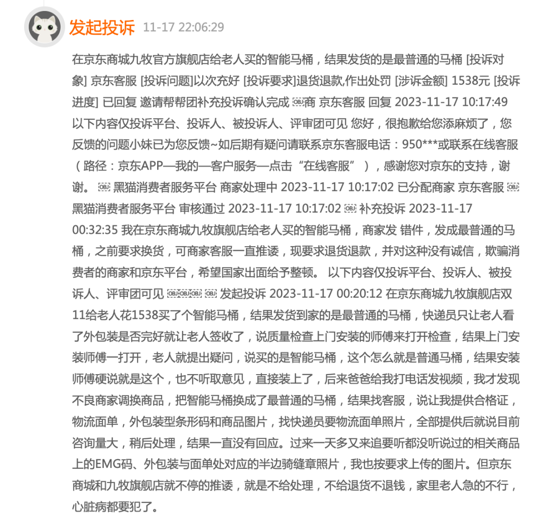 无独有偶,在黑猫投诉平台上,我们还能看见更多关于九牧智能马桶的投诉信息。