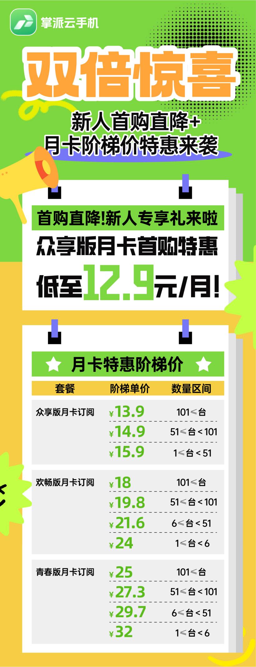 掌派云手机为新用户准备了超值的首购福利。新用户首次购买众享版月卡,低至12.9元/月!此外,掌派云手机还提供了月卡特惠阶梯价,让用户可以根据自己的需求选择合适的套餐。
