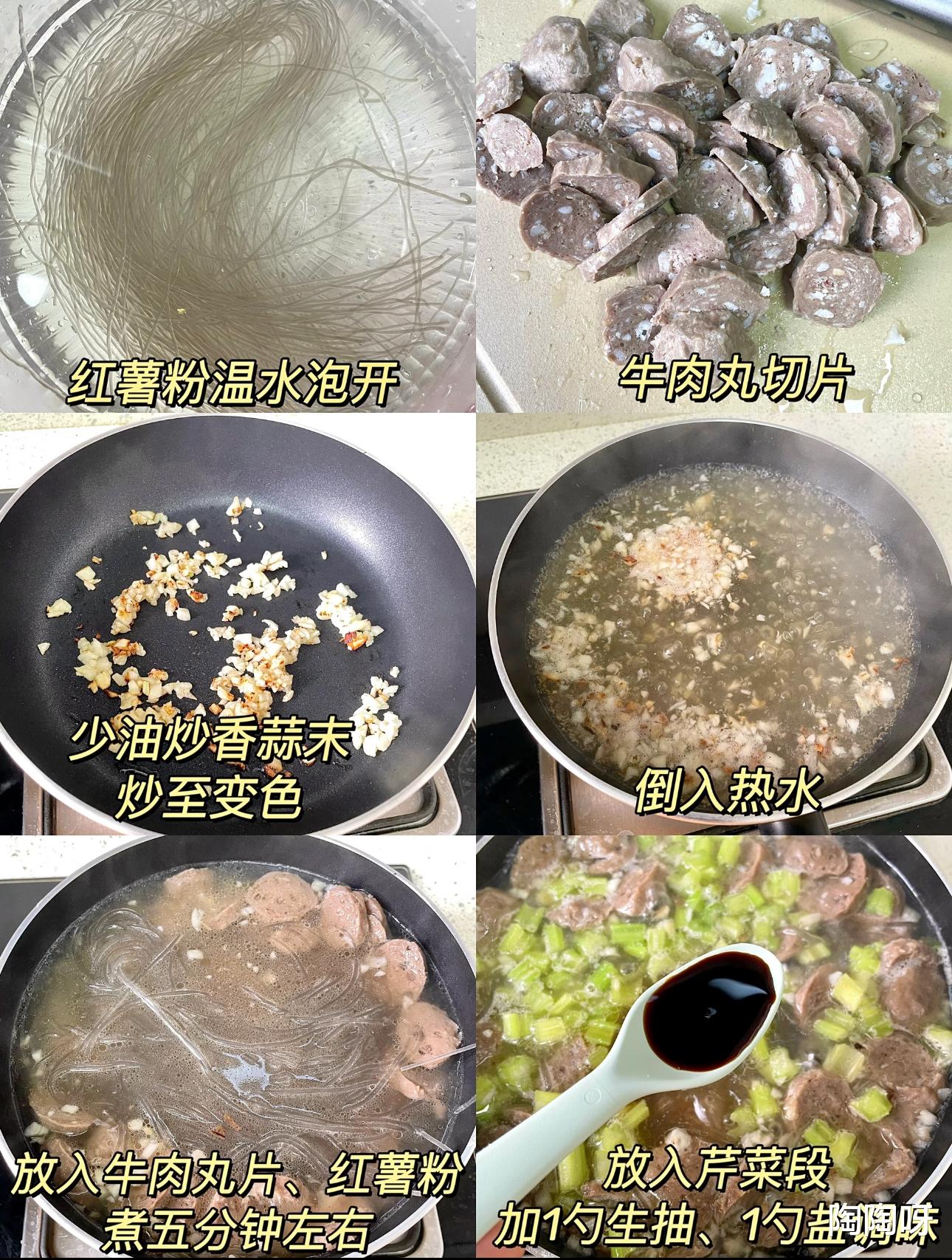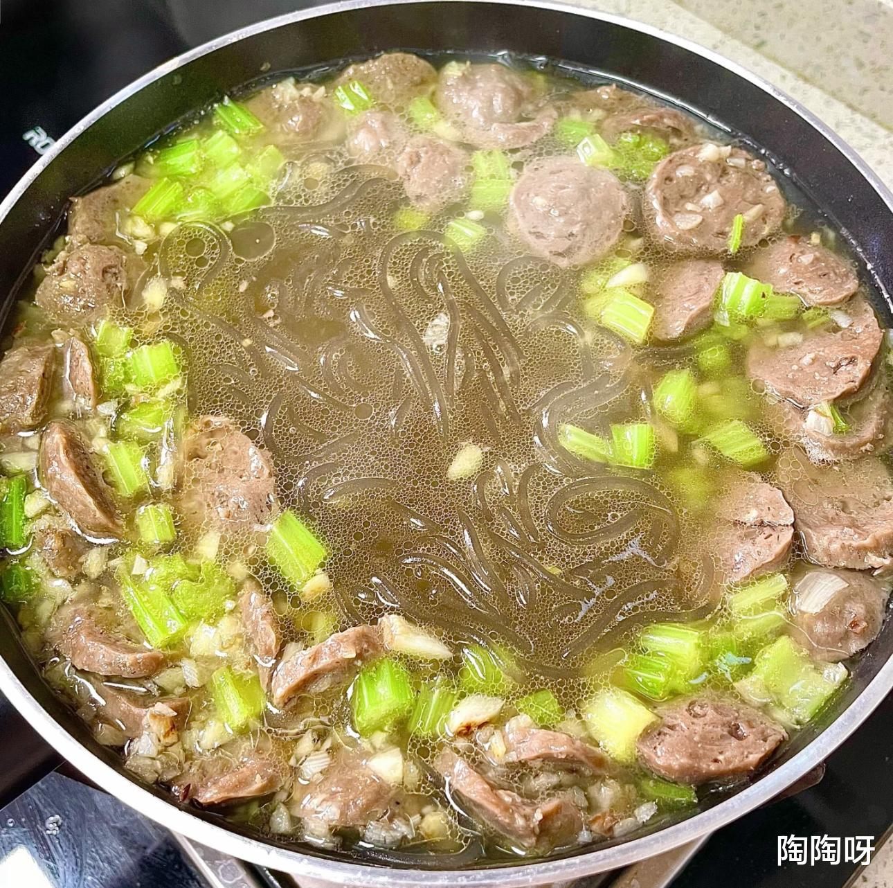 - 待牛肉丸浮起,粉丝至透明,放入芹菜段,加入1勺生抽,1小勺盐调味即可。