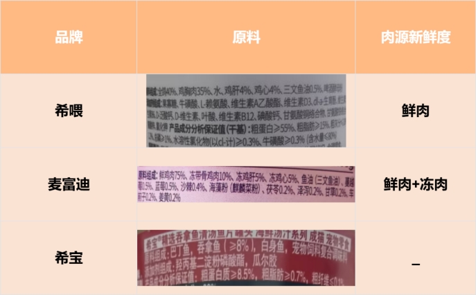 【测试过程】仔细对比三款猫罐头的原料表,看看首位是否标明清晰的肉类名称及其占比,水分含量是多少,是否含有谷物、淀粉、诱食剂以及胶质物。