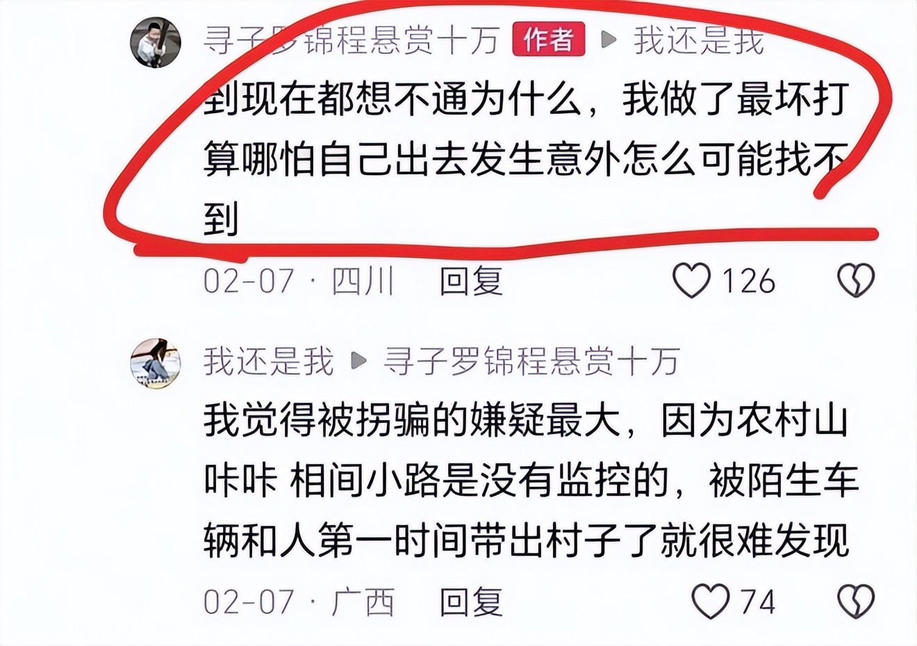 村里的老人说,每天都能看到罗女士和孩子的外公外婆在山里转悠,逢人就问有没有看到孩子,哪怕得到的都是否定的答案,他们也从未放弃。那 10 万悬赏,是这个普通农村家庭能拿出的全部诚意,他们不求别的,只求能找到孩子,哪怕只有一丝希望,也会拼尽全力。