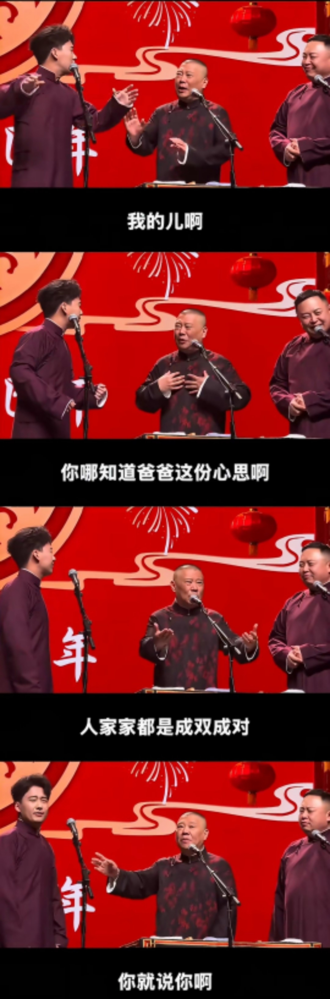 其实,这句看似“大逆不道”的玩笑话,细品却全是高情商。在相声的语境里,这句话既是对父亲“望子成龙”心态的幽默回应,也是一种独特的“立业宣言”。它翻译过来的意思大概是:我能有今天,靠的是自己一步步打拼,您这位当爹的也没怎么“帮上忙”啊!这种你来我往的互怼,早已成为德云社舞台上最动人的风景线。它不像传统家庭中那种严肃压抑的父子关系,反而用幽默和坦率,把最真实的情感摊开在聚光灯下。