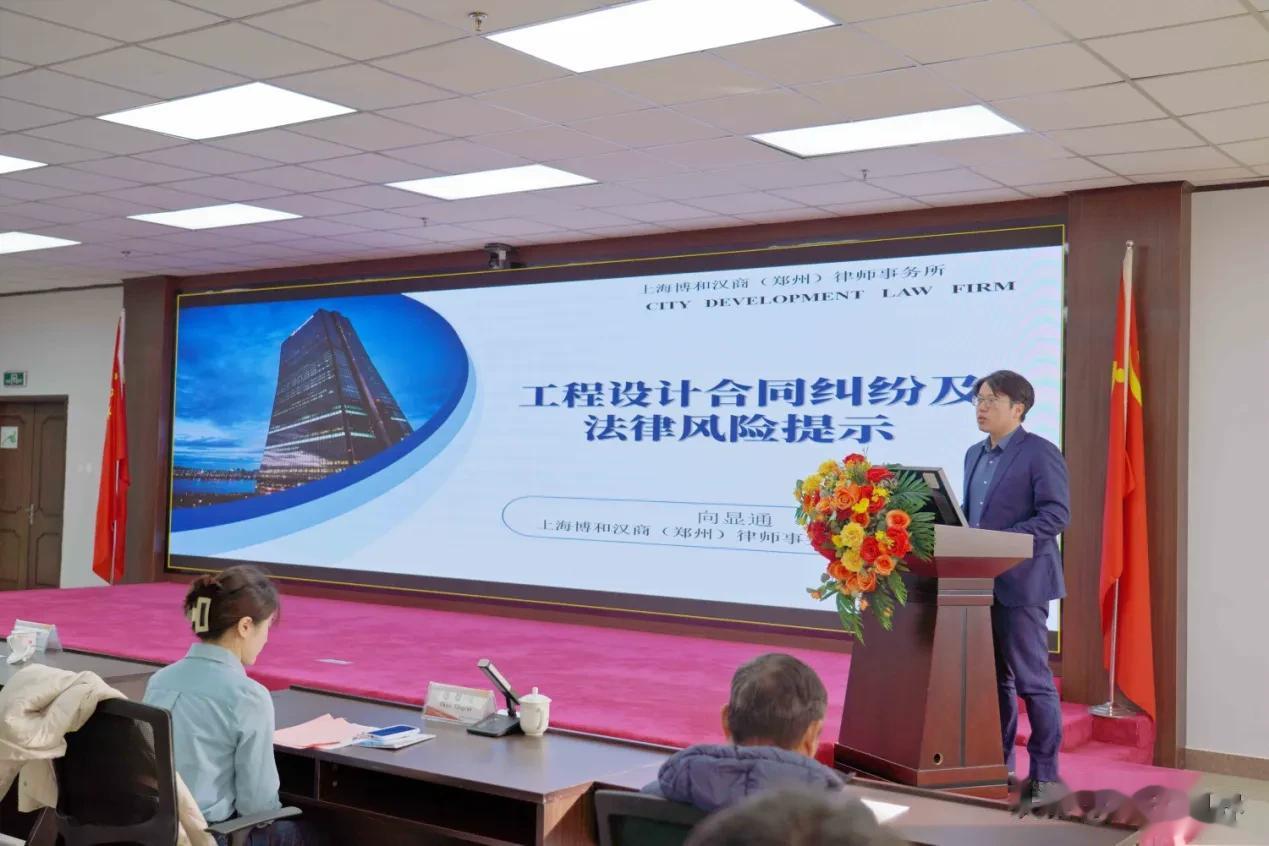 活动聚焦提升行业风险防控能力,推动高质量发展。河南知名律师,上海博和汉商(郑州)律师事务所创始合伙人、执行主任向显通在会上作了《工程设计合同纠纷及法律风险提示》专题分享。他围绕设计合同效力、成果交付、费用支付及工程总承包联合体纠纷等六大核心议题,结合典型案例深入剖析,提出了具有操作性的风险防范措施。