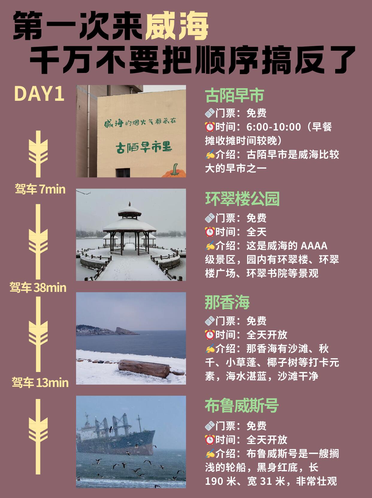 第一天特意定了很早的闹钟⏰,去了古陌早市,挤在人堆里买炸糕当早餐吃😋。逛完以后去了环翠楼🏯,站楼上能瞅见威海大半城,风一吹脑瓜子都清醒了🍃。后来去那香海和布鲁威斯号🚢,车程有点长,不过风景还可以👌