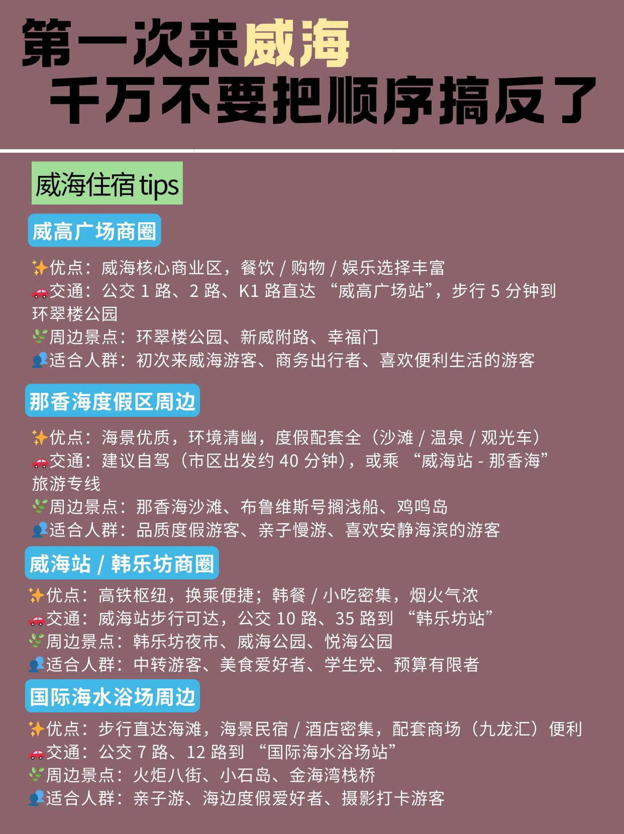 住宿选了威高广场商圈🏨,下楼就能买奶茶吃小吃🥤,晚上遛弯十分钟到幸福门✅,就是周末人有点吵🙉交通基本靠公交🚌,1 块钱能坐好远,就是去郊区的车收得早⏳,上次差点没赶上末班车,跑得上气不接下气🏃♀️。