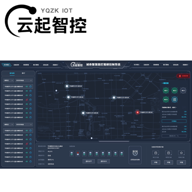 * **GIS电子地图总览:** 所有路灯、配电柜在地图上一目了然,颜色区分在线/离线、开关状态,支持在地图上直接点击设备进行操控,实现“一张图”管全城。