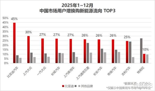 更为关键的是,比亚迪于新能源增换购市场构建起强大的“虹吸效应”。无论是比亚迪自身的老车主,亦或是主流合资、自主品牌车企的用户,在进行新能源车型置换时,皆将比亚迪列为首选品牌。