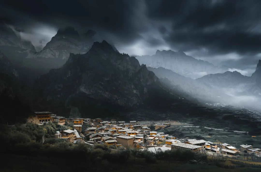 清晨,晨雾从山谷中缓缓升起,笼罩着整个藏寨,阳光穿透云雾,洒在寺庙的金顶上,熠熠生辉。藏式的榻板房错落有致地分布在山坡上,梯田蜿蜒如带,叠翠流金,恍若世外桃源。