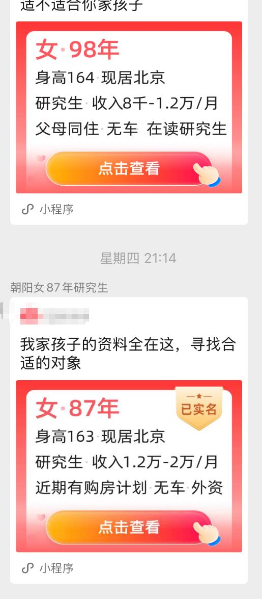 “ 我家孩子的资料全在这,寻找合适的对象”、“ 这个 1998 年的女孩条件挺好的,适不适合你家孩子 ”。在莫一个面相爸妈辈的相亲小程序的相亲群聊中,父母们把自己孩子的资料卡像 “ 商品链接 ” 一样四处发送。