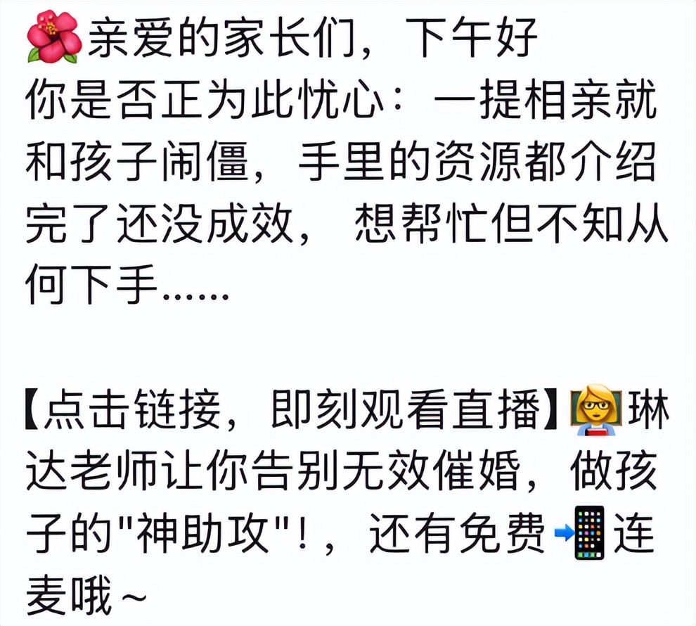 “孩子每次都不想听你说这些,那你有没有做复盘?” 、“ 你拿不到结果是正常的。 我们不光是家长,我们要做一个合格的红娘,合格的红娘是你得先和你的孩子达成共识。”、“ 在相亲开始之前,就要跟孩子去做很多问题的梳理。我们前两年的课程说过了,他有必备项、必选项、有优先项、有加分项,我们就不要那么草率的开始,先跟孩子深度沟通,把孩子的思路梳理清楚。” 在群聊中,小管家每天都会发布 “ 专业情感老师 ” 的直播链接,而在免费的直播里,情感老师基本几句话就精准戳到了家长们的痛点。