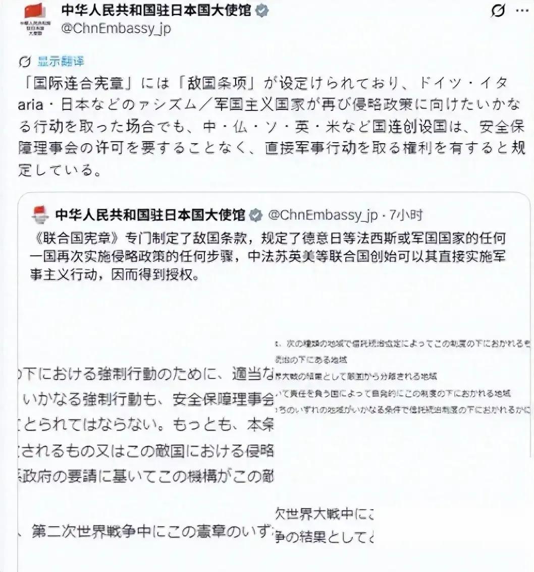 更为令人震惊的是,“我国”驻日大使馆用中日双语发布声明,提到了“敌国条款”,这是针对日本这个战败国最直接的警告。在日本与“我国”关系逐渐紧张的这段时间里,西方国家并没有对日本提供任何实质性的支持,相反,“我国”的反制力度却出乎所有人意料地不断升级,不仅派军舰进驻钓鱼岛周边,还向联合国秘书长古特雷斯发去了致函,要求其对日本进行制裁。