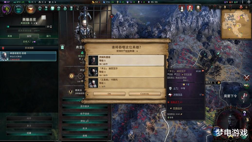 此外,监狱里的敌军英雄,我们可以直接吃掉他们,吃掉之后会获得经验,这个可以选择我方任意一个英雄单位执行操作。如果点了亡灵魔典的话,还可以把死掉的英雄以鬼魂的形态召唤,继续为我们打工。