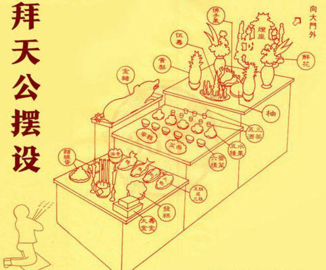 届时,在庭院里、或胡同口等,要提前布置好露天的祭拜现场。通常是用长板凳覆盖金纸、然后在长凳上放上八仙桌,桌上靠后摆一道纸糊的“天公庙”。“天宫庙”象征玉帝神位,往往会做的很高大。