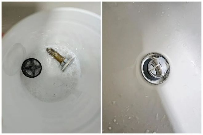 2)面盆下水:把弹跳芯和和漏网拿出来,用洗洁精+热水泡一泡,不仅可以清洁污垢,还能让按压器变得十分丝滑。