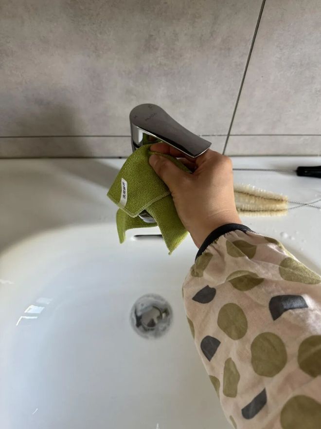 阿姨早起洗漱完,都会顺手把台面清洁一下。也不需要多复杂,拿块鱼鳞抹布把水渍和龙头擦掉就好。