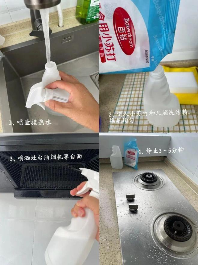 1)厨房油污:不需要买清洁剂,用「小苏打+热水+洗洁精」就能轻松搞定,简单又没异味。