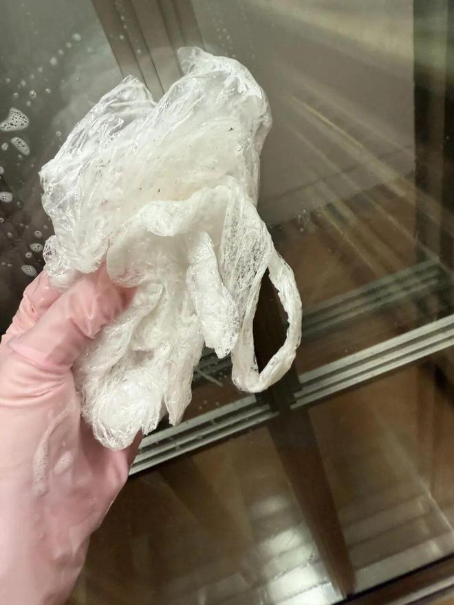 3)玻璃水垢:「洗洁精+白醋」喷在玻璃上打了泡沫,静置20分钟后找个塑料袋擦拭,最后用水一冲干干净净。