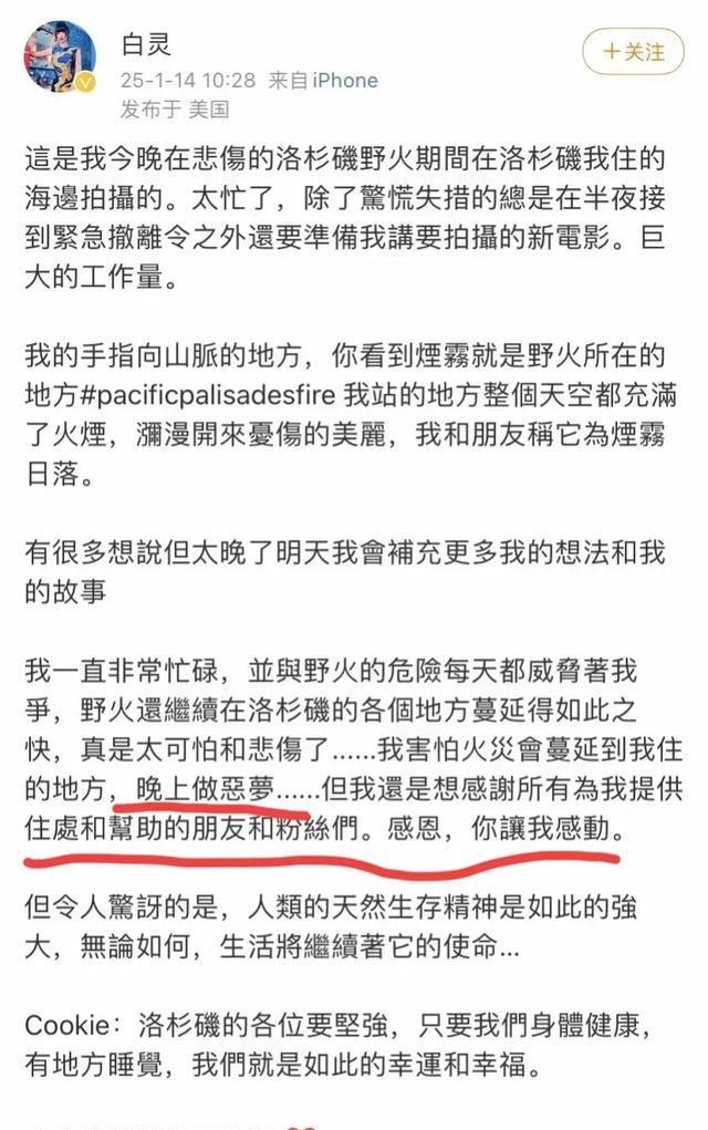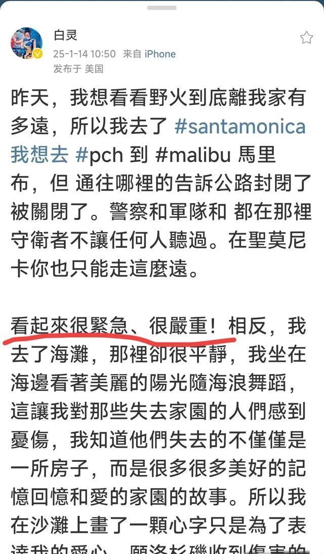 白灵晒出的照片中,海滩远处有一座大山,那里正在冒着浓烟,她的家也在那里。因为洛杉矶火灾严重,回家的路已经被封锁,白灵作为明星也被拒绝,她和其他富豪一样,面临豪宅被烧毁的处境。