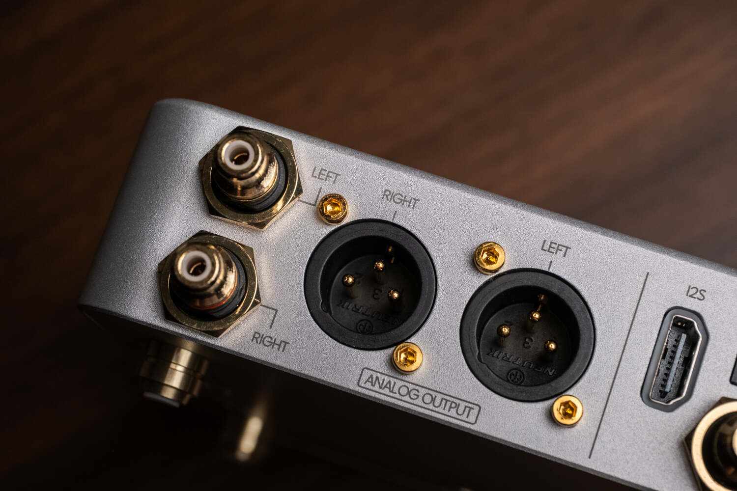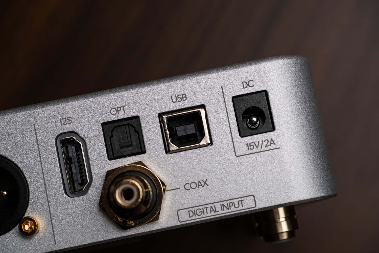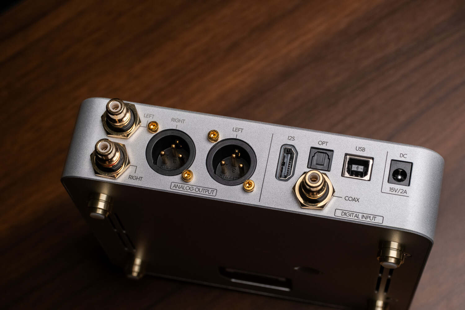 机身背后是密密麻麻的输入输出接口。中间用一根细线将左右区分开来,左边是模拟输出和平衡输出接口,右边是I2S、同轴、光纤、USB输入接口——USB给的是传统的方口(USB-B),应该是为了和传统HiFi音频设备兼容,实际上VERSE这么棒的体积和声音我觉得搭配手机或PAD更加合适,好在B口也有转TYPEC的线材或转接头,这个需求不难实现。最右边是15V/2A的DC电源接口,也就意味着这机器是可以搭配线性电源来进一步提升音质潜力的。据悉官方线电也已经在开发中了。