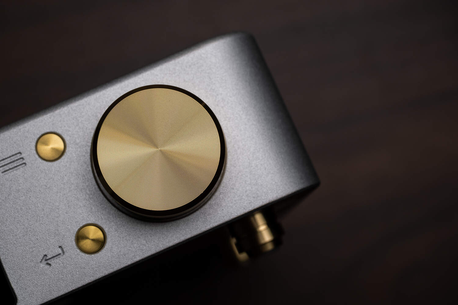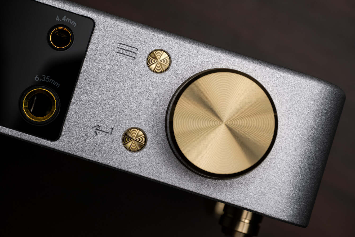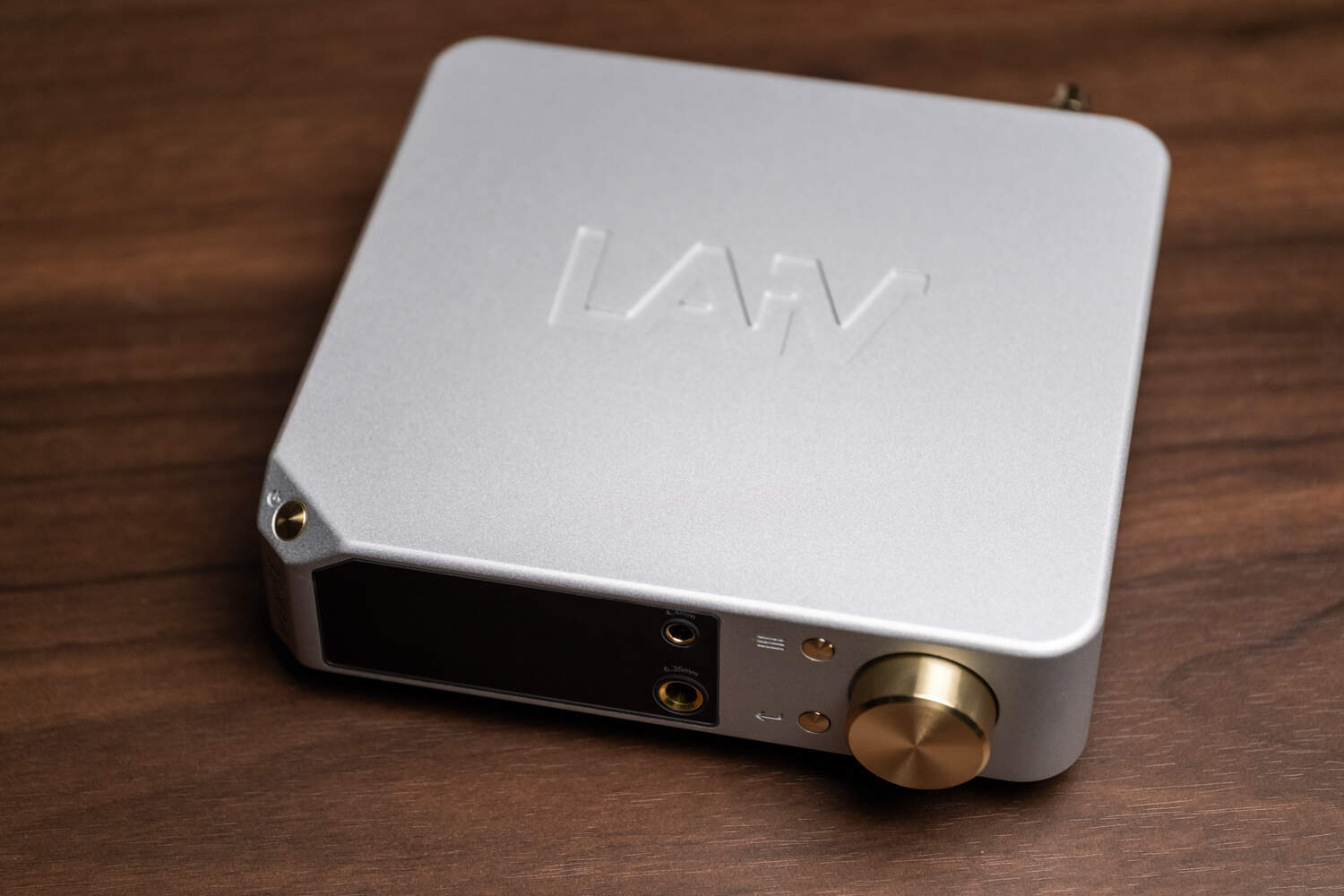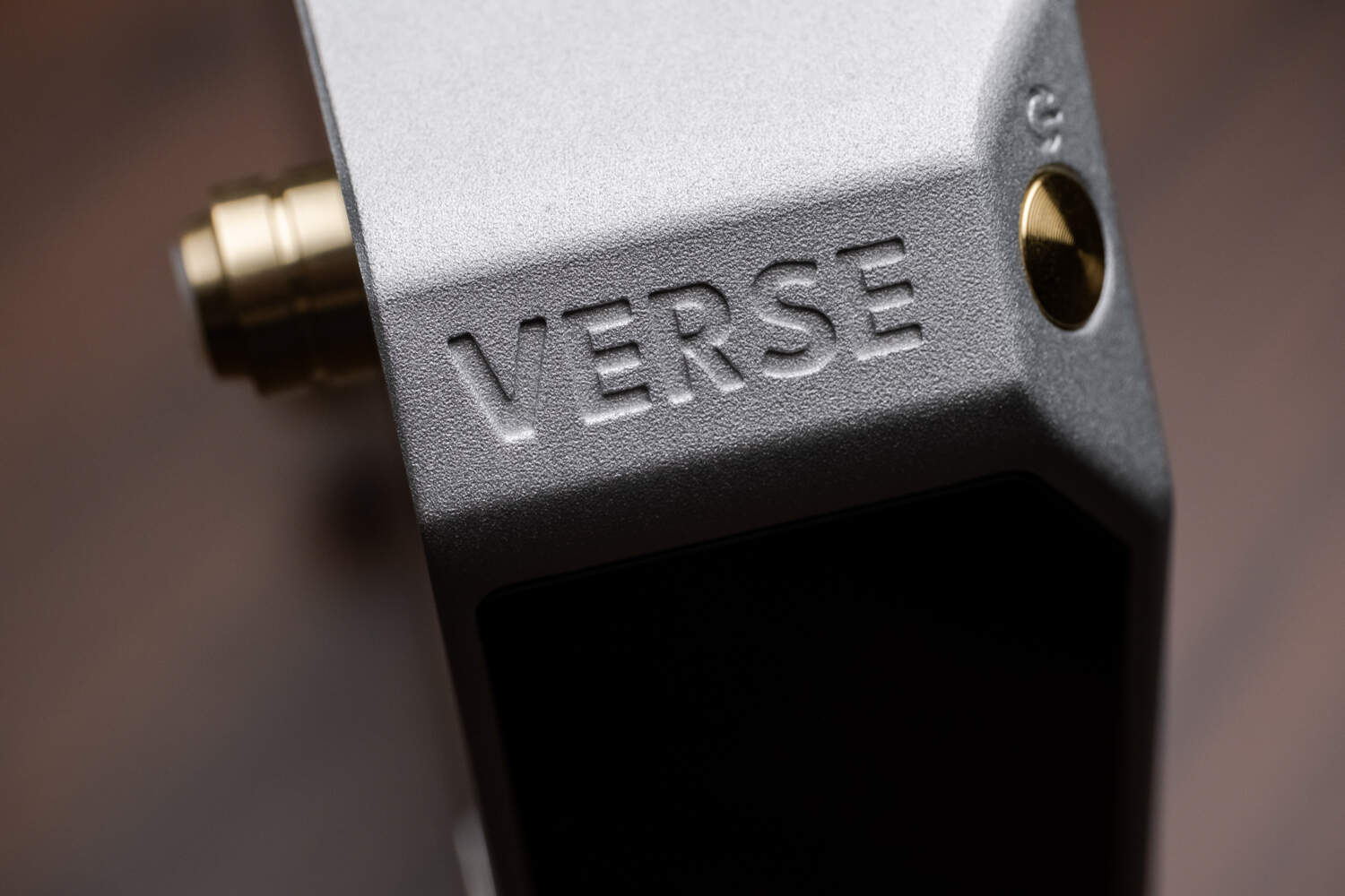 一方面,VERSE是乐音芙品牌产品外观设计风格的缩影。它延续了该品牌音频设备方正、有质感的设计风格,表面的金属喷砂工艺极为细腻。在机身顶部有凹刻的LAiV品牌logo,简单大方;机身正面左边是一块黑色的“缺角矩形”区域,内藏了一块屏占比很高的横向显示屏,以白色点阵字体显示内容,因为字体较大加上屏占比的缘故,VERSE在工作状态会有一种“左半边全是屏幕”的感觉;屏幕右边是6.35mm和4.4mm耳机孔,支持单端和平衡耳机输出。右边的银色区域首先是两枚物理按键,分别是菜单/返回键和下面的确认键;最右边是体型较大的金黄色多功能旋钮,在播放状态下用于调节音量,而菜单状态下用于选择选项,配合两枚物理按键可以实现VERSE内置系统的各种操作。这两枚按键的手感有点偏硬,如果是大量操作的话使用附送的遥控器会轻松一些。而这枚旋钮的手感则非常好,段落感和阻尼感极为优秀,甚至没事去拧两下还能解压……