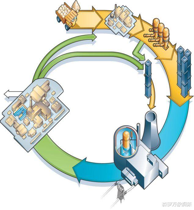 反应堆的热能会被转化为电能,为电网供电。反应堆卸出的燃料经过简单的后处理,去除裂变产物后,再次制成燃料组件,返回反应堆循环使用。