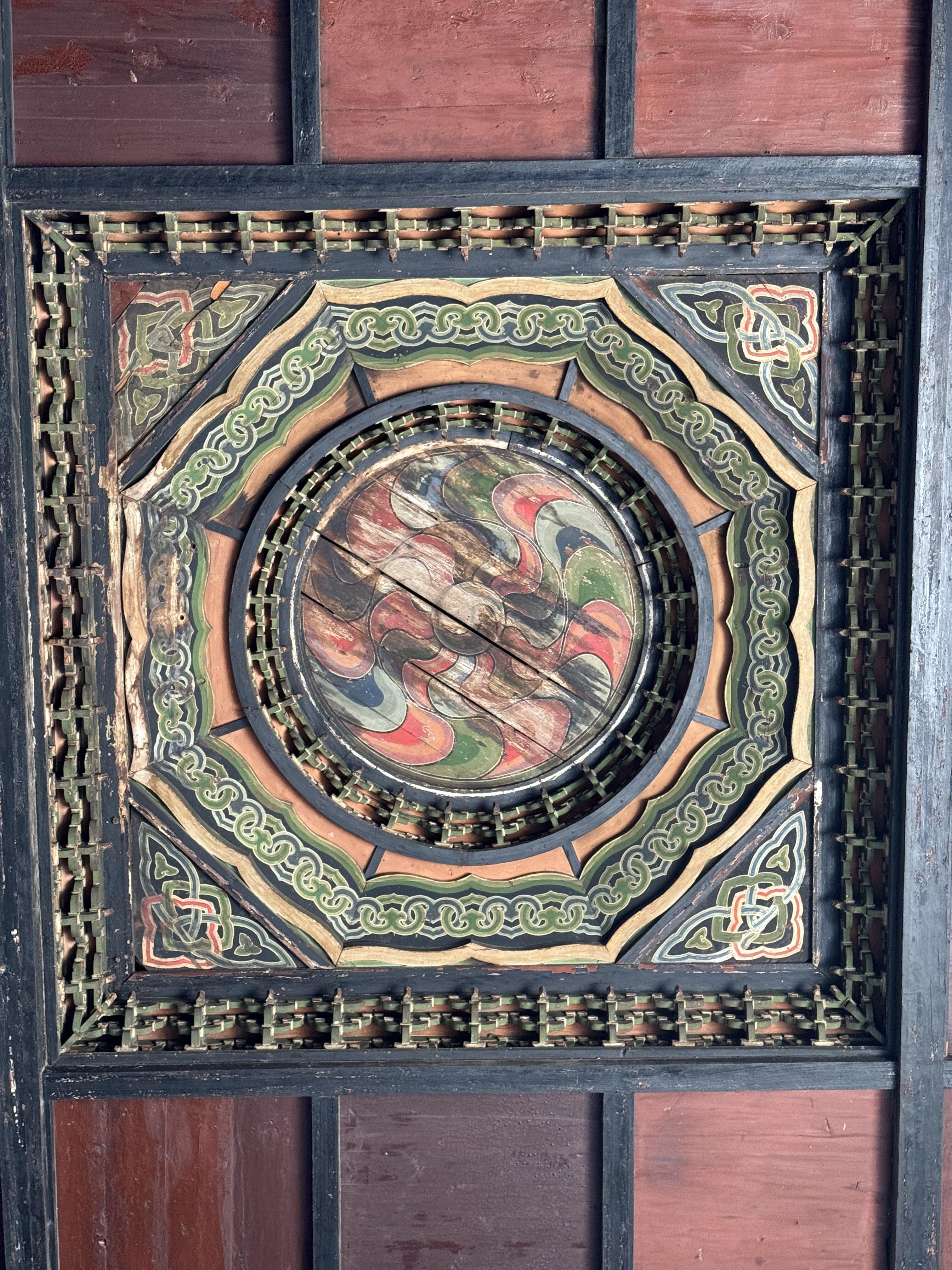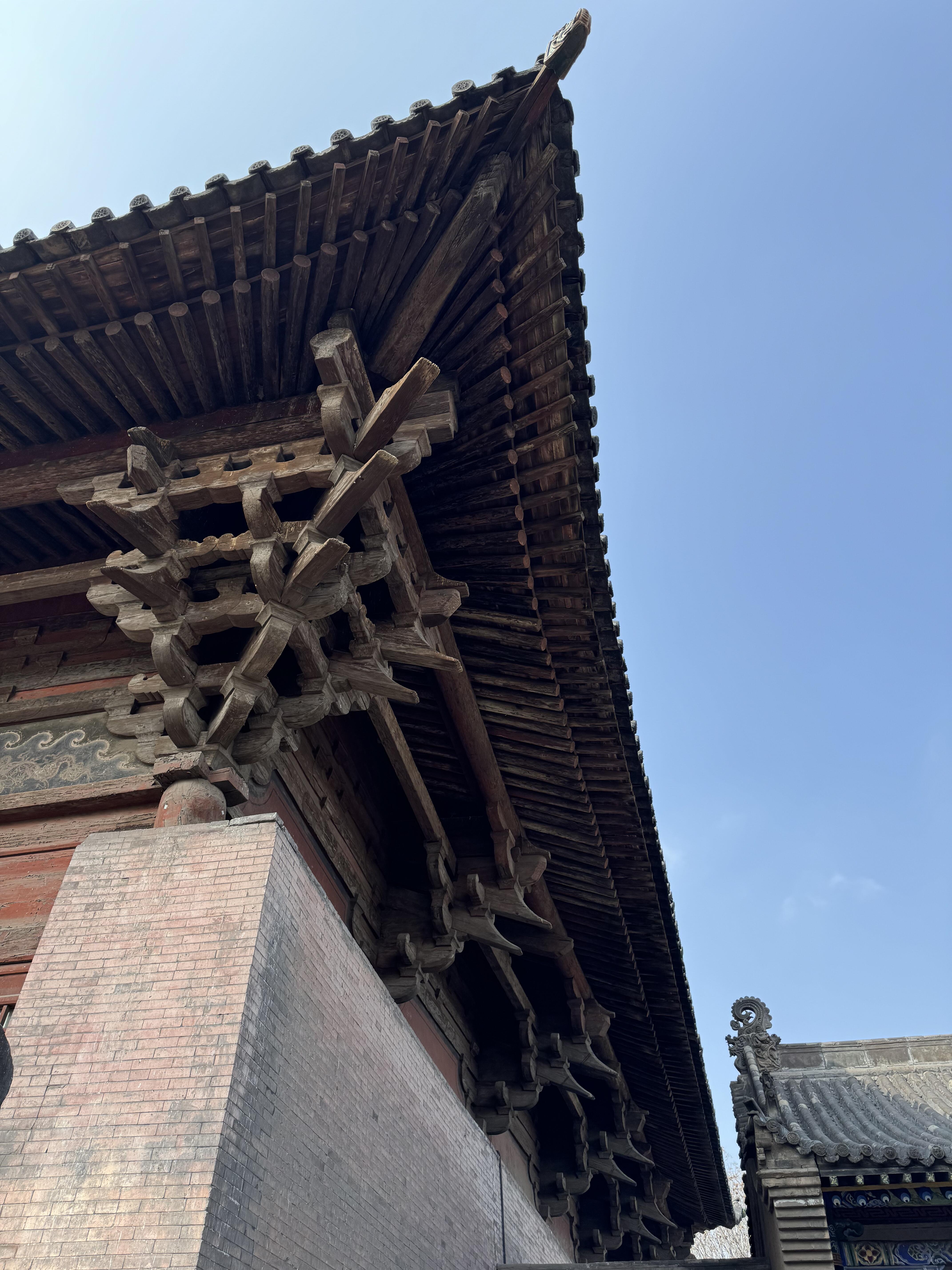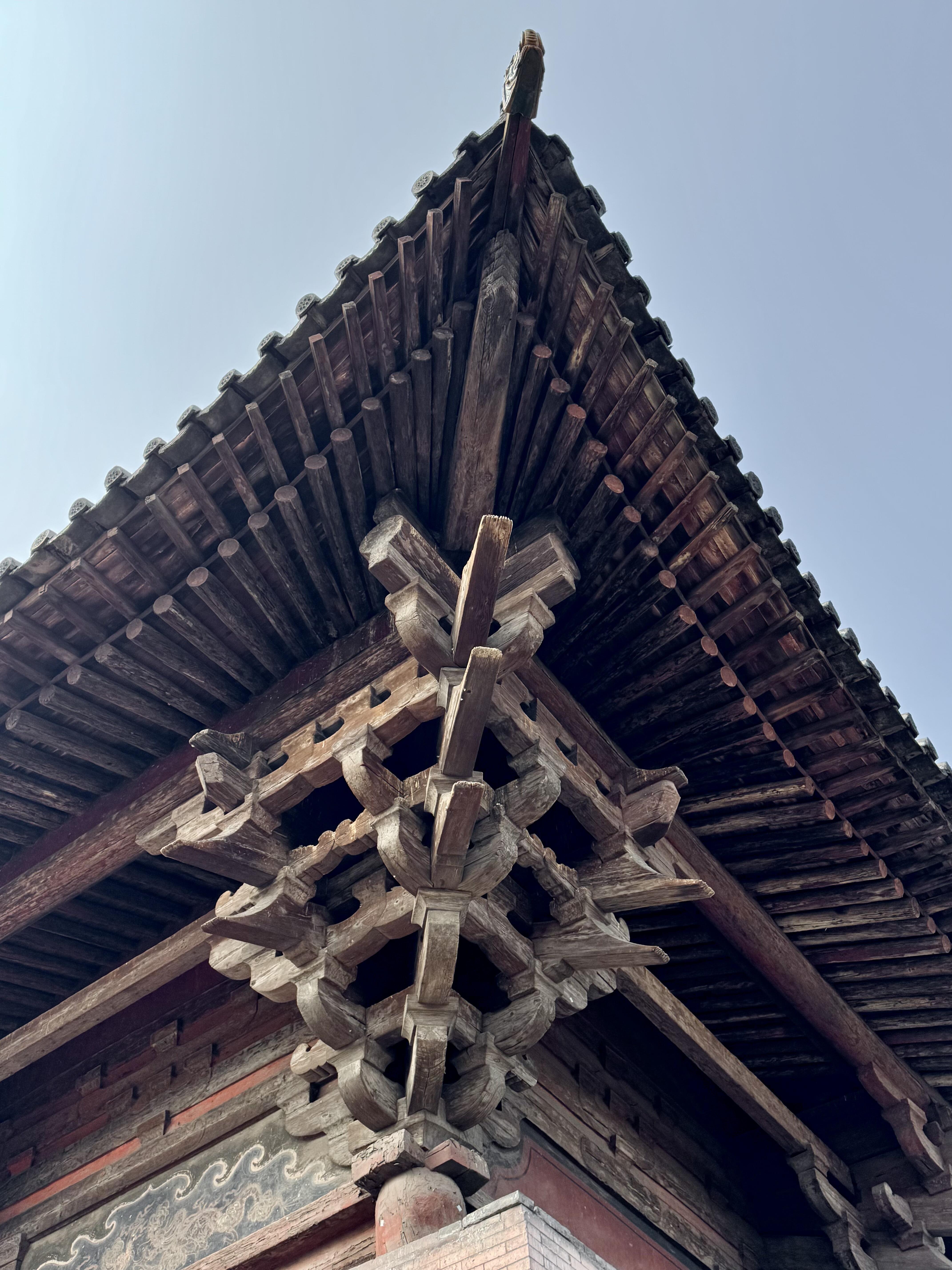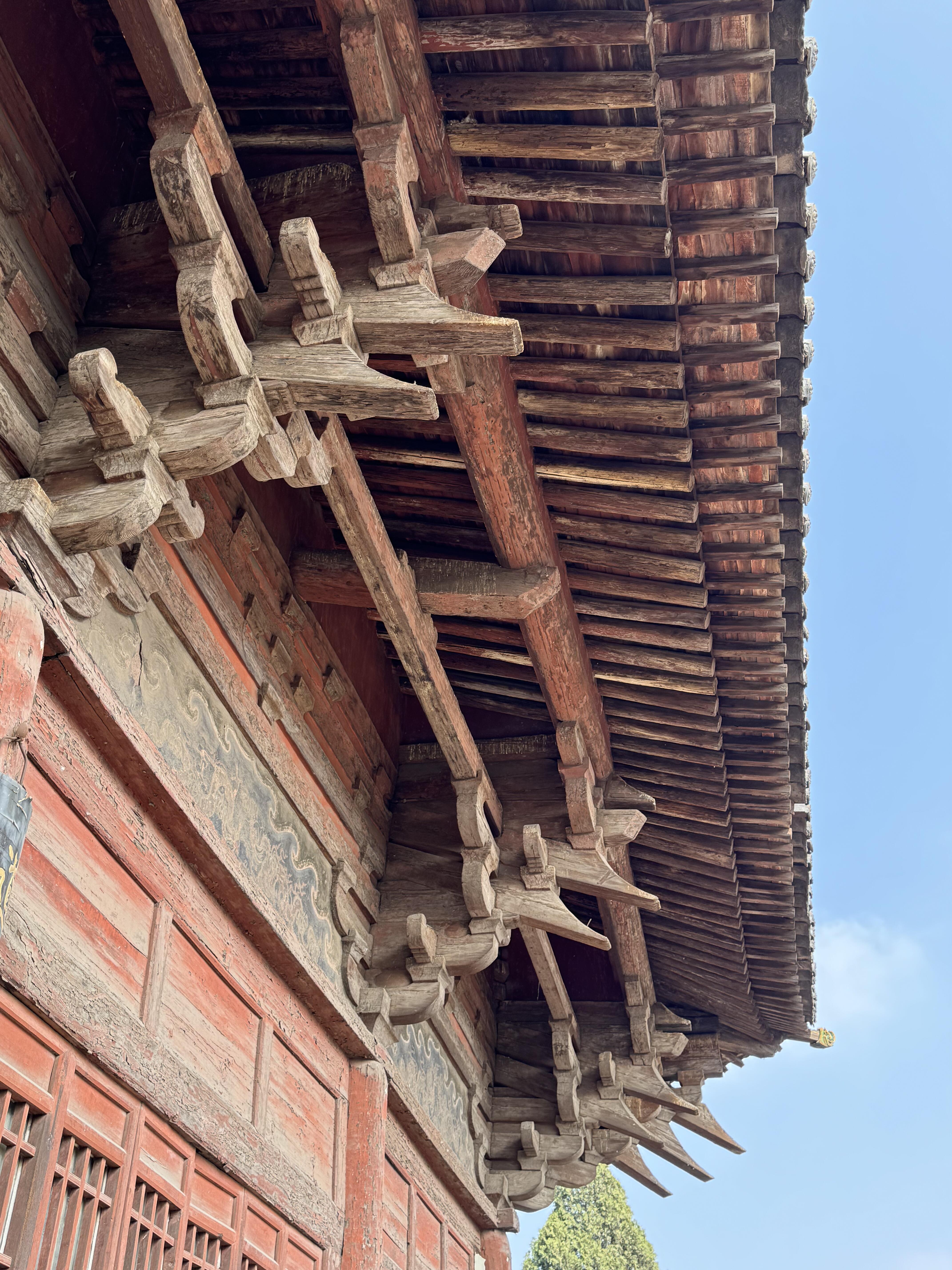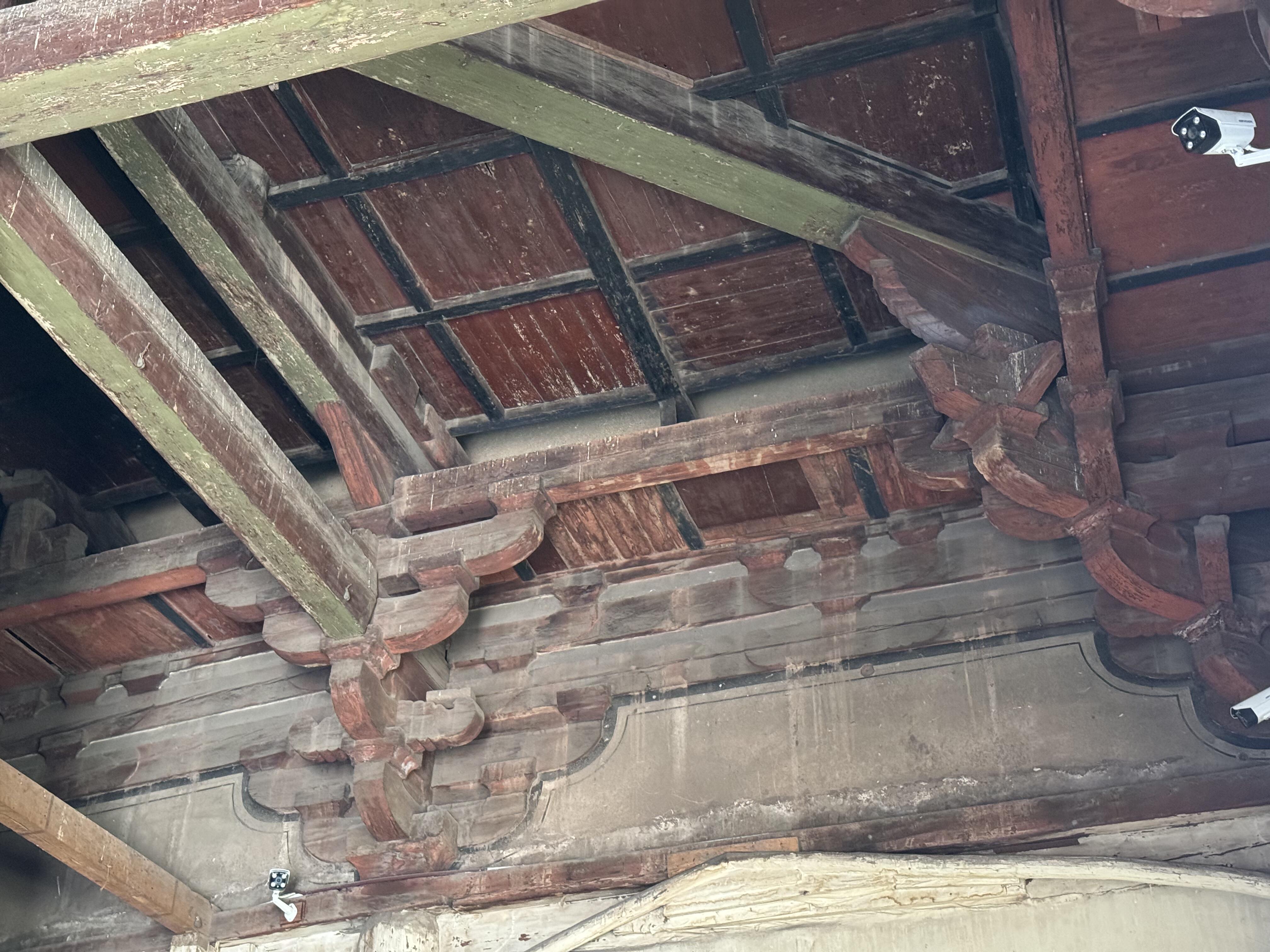 踏入殿内,开阔的空间让人豁然开朗。金代建筑惯用的减柱造手法在此得到应用,减少了部分内柱,扩大了祭祀活动的空间。梁架采用草栿做法,未经精细加工的原木直接作为承重构件,表面还保留着斧凿的痕迹。这些看似粗糙的处理,实则体现了金代工匠对材料特性的深刻理解——以天然木材的原始形态,最大限度发挥其力学性能。抬头仰望,四椽栿、六椽栿层层叠加,驼峰、蜀柱、叉手等构件相互配合,构成稳固的三角形受力体系。虽然历经八百多年的风雨,大殿的梁架至今仍保持着良好的状态,无声地证明着古代木结构建筑的精妙之处。
