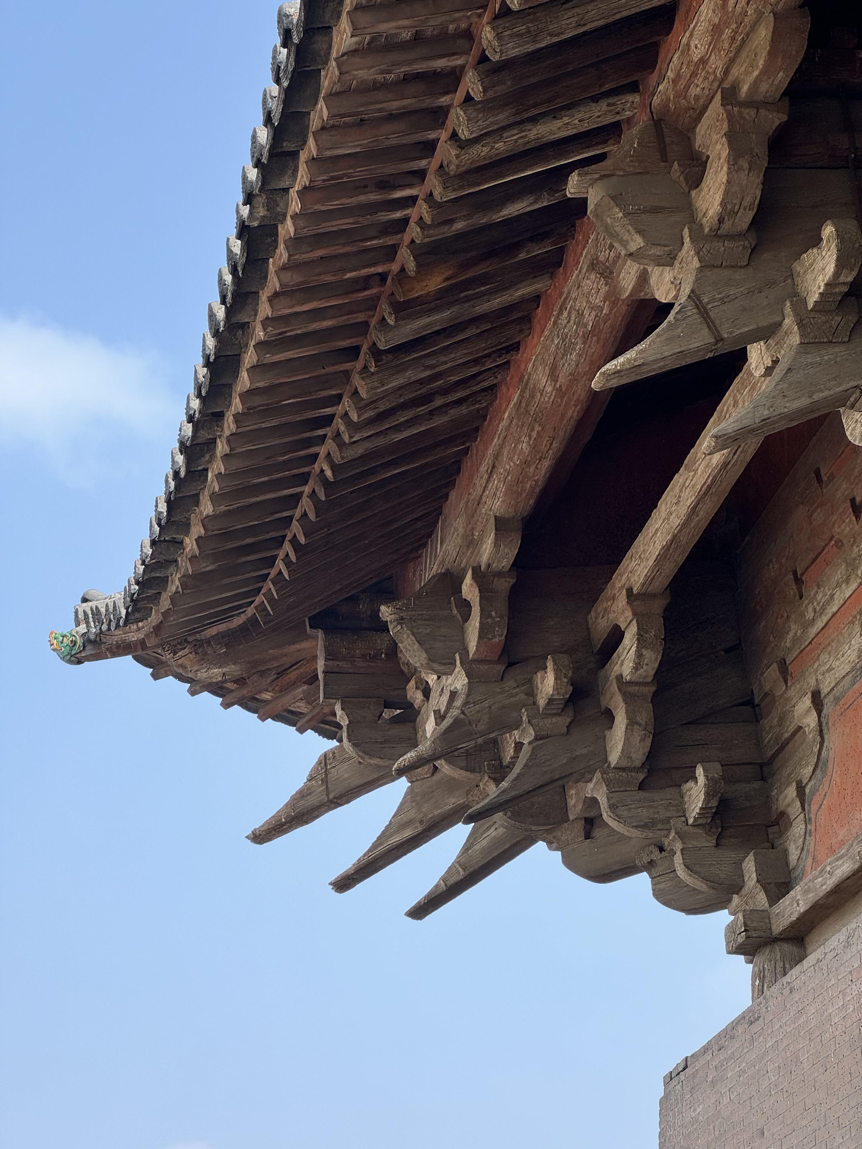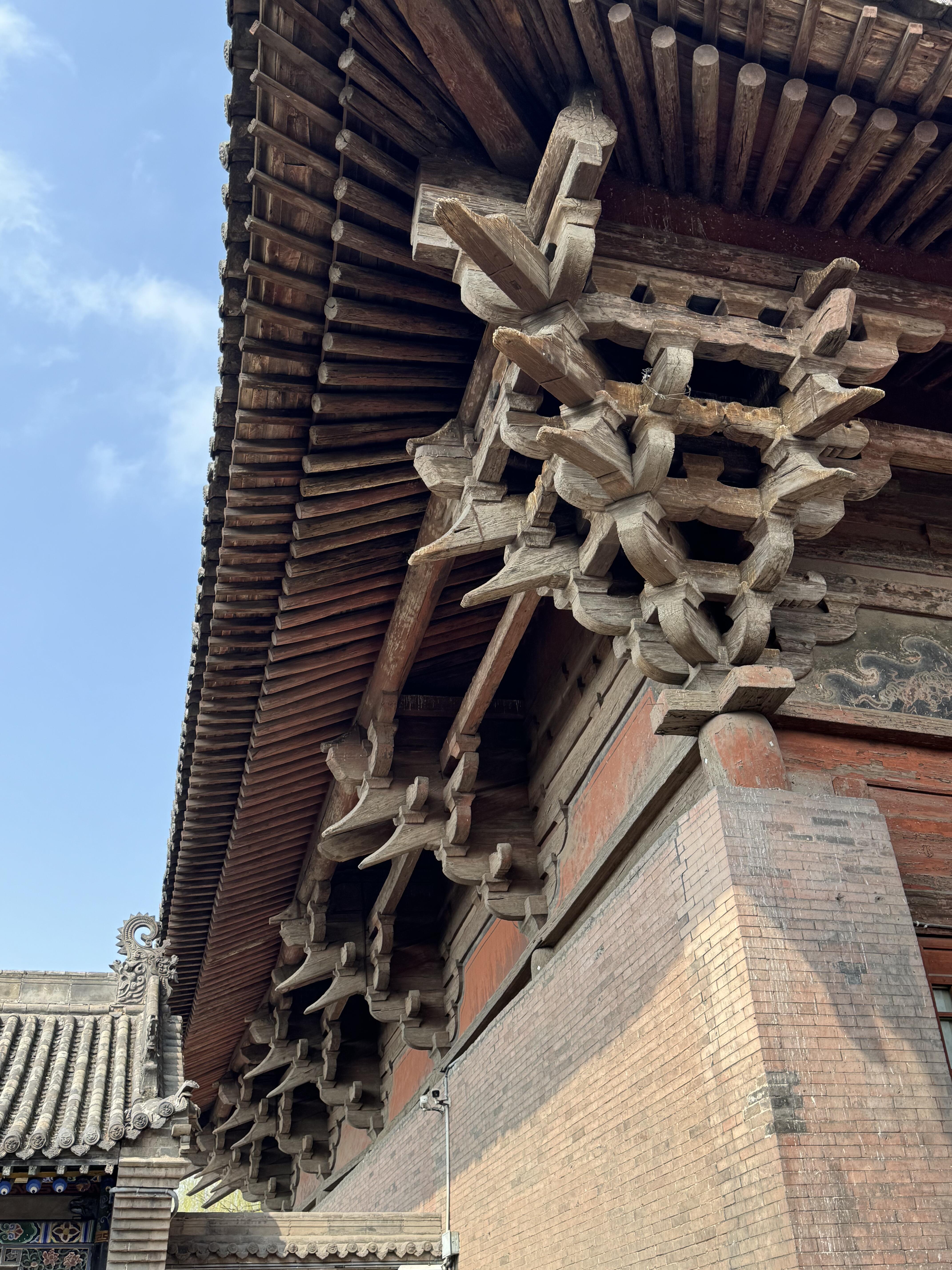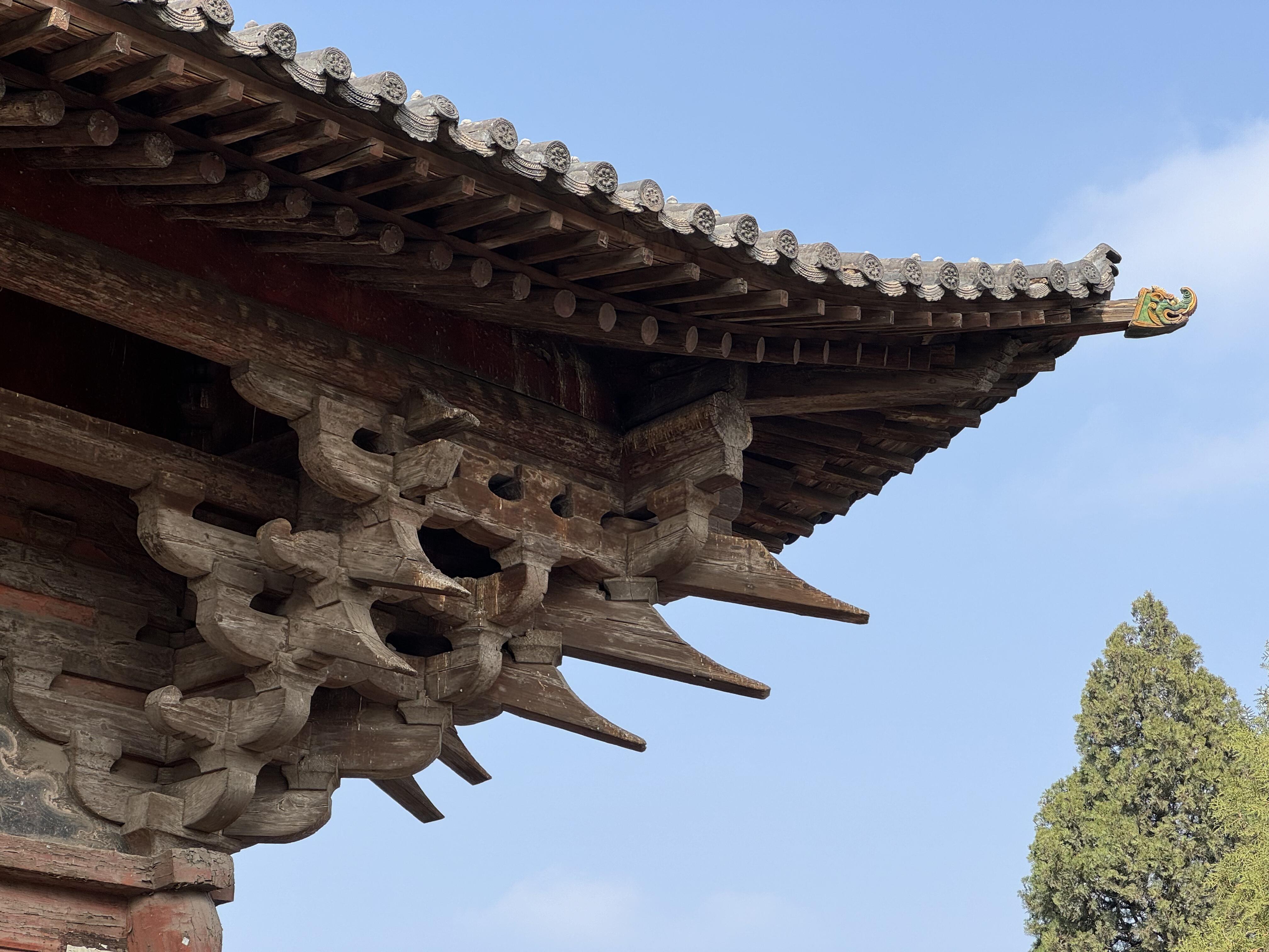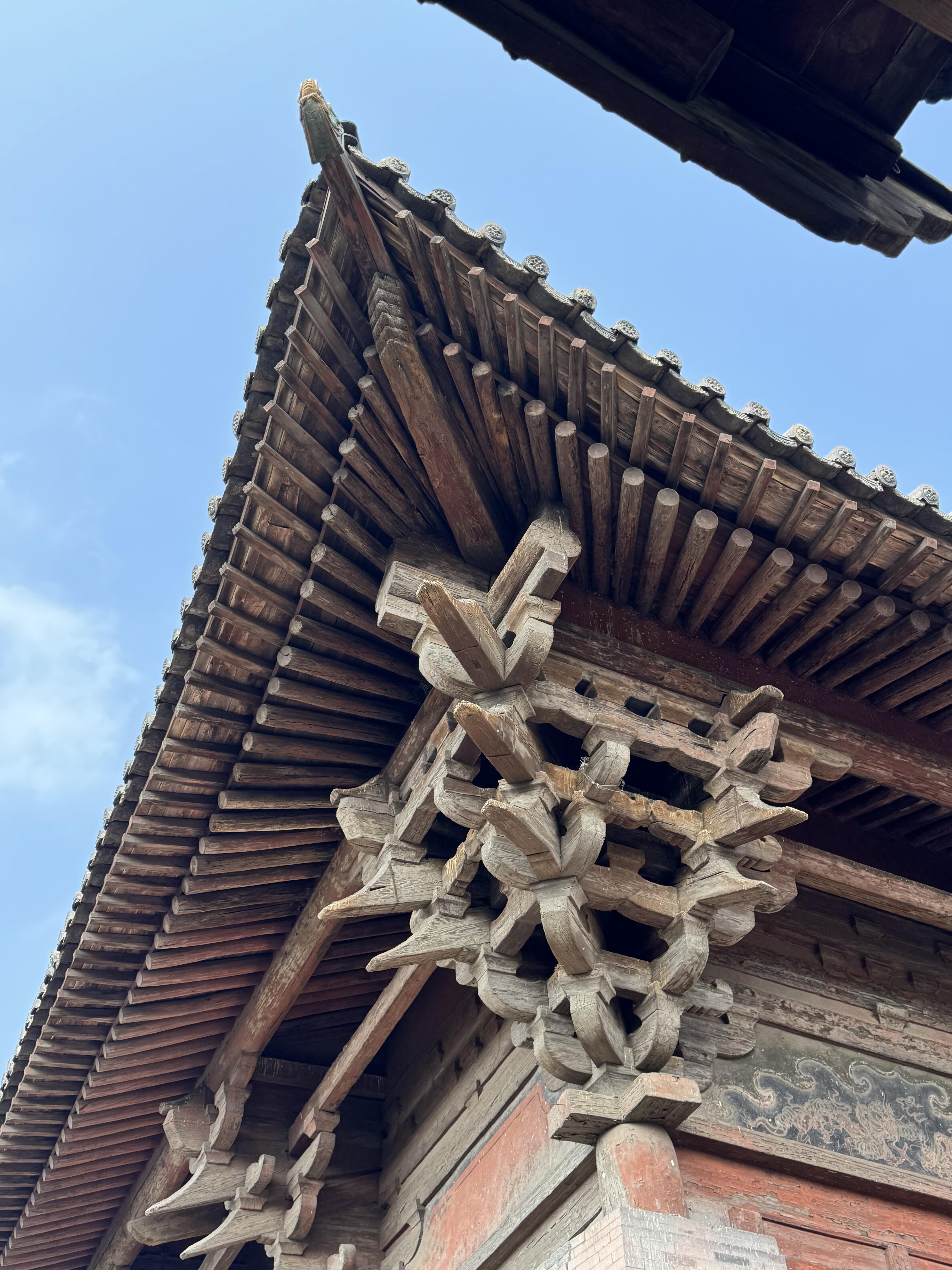 仔细观察,柱头铺作采用罕见的七铺作双杪双昂结构,层层出跳间,第一、三跳施翼形栱,如同展开的羽翼,轻盈却不失力量感。这种做法在现存古建筑中极为少见,翼形栱的曲线与直线相互交错,既符合力学原理,又增添了装饰性。补间铺作则使用一类昂结构挑起橑檐枋,不同于常见的斗拱组合,这种做法让檐口呈现出独特的弧度,远观如飞鸟振翅,近看则能体会到工匠对结构创新的探索。站在殿前仰头望去,密密麻麻的斗拱仿佛一片凝固的云,光影在木构件的凹凸间流转,将金代建筑“以材为祖”的营造理念展现得淋漓尽致。