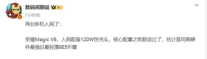 日前,数码博主“数码闲聊站”爆料称,荣耀Magic V6已经入网,该机将配备120W有线快充,这一快充也是目前折叠手机中的最高配置了。此前该博主已经曝光了不少关于该机的信息,此次该博主还透露,估计荣耀Magic V6可能是同期硬件中最强且最轻薄的搭载高通第五代骁龙8至尊版处理器的折叠手机。
