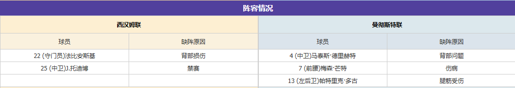西汉姆联方面,托迪博因在对阵切尔西时染红,本场继续停赛;替补门将法比安斯基因背部伤势仍无法出战。