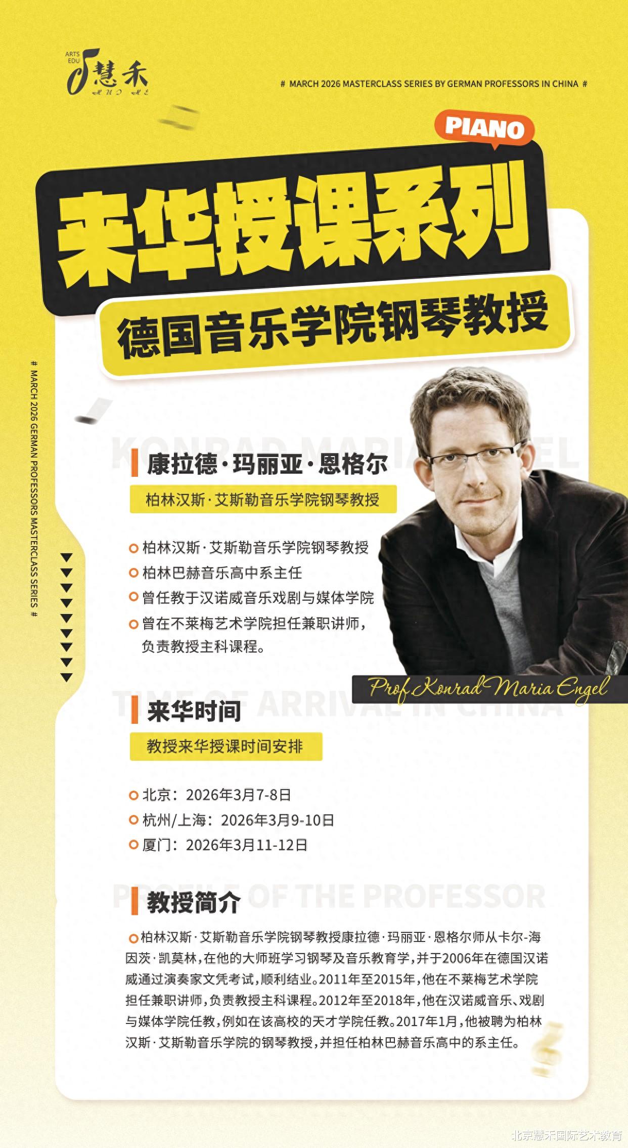 正值德国音乐学院冬季学期申请黄金筹备期,赴德深造的梦想通道已为你敞开!慧禾国际艺术教育重磅加码,全力护航留德音乐学子 —— 不仅特邀德国代特莫尔德音乐学院钢琴教授彼得・奥茨科夫斯基 3 月 5-6 日北京授课,更有柏林汉斯・艾斯勒音乐学院钢琴名师康拉德・玛丽亚・恩格尔,于 2026 年 3 月 7-12 日开启七天精品巡讲!课程横跨北京、杭州 / 上海、厦门等多城,原汁原味的德式教学、与顶尖教授零距离交流的难得机遇,热爱音乐的你千万别错过,即刻报名锁定席位!