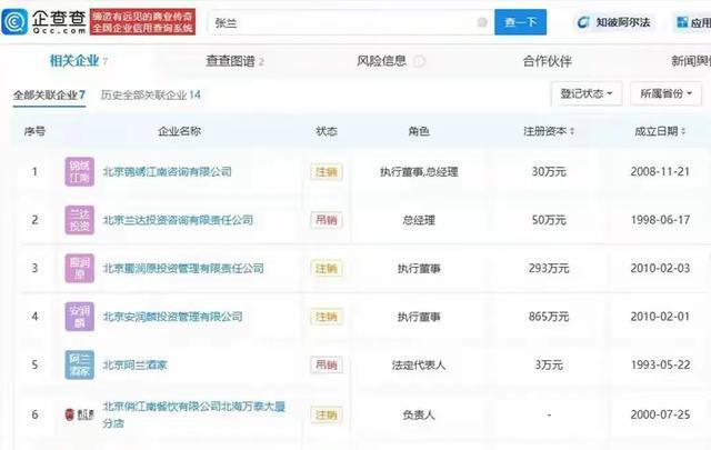 与此同时啊,张兰旗下的那些公司,就像失去了阳光照耀的花朵,都没有了生机。通过天眼查之类的专业平台可以看到,那些和她关联的公司,状况可谓惨不忍睹。不是被吊销营业执照,就像被宣告了死刑,彻底没有了希望;就是已经注销,灰飞烟灭般的消失在市场之中。这些公司啊,曾经可是张兰商业梦想的寄托,是她一步一步亲手打造起来的商业帝国的重要基石啊。从最初的创业激情,到一步一步艰难前行,它们承载了太多的希望、汗水和泪水。然而,现在却都没能逃脱这样的悲惨结局。