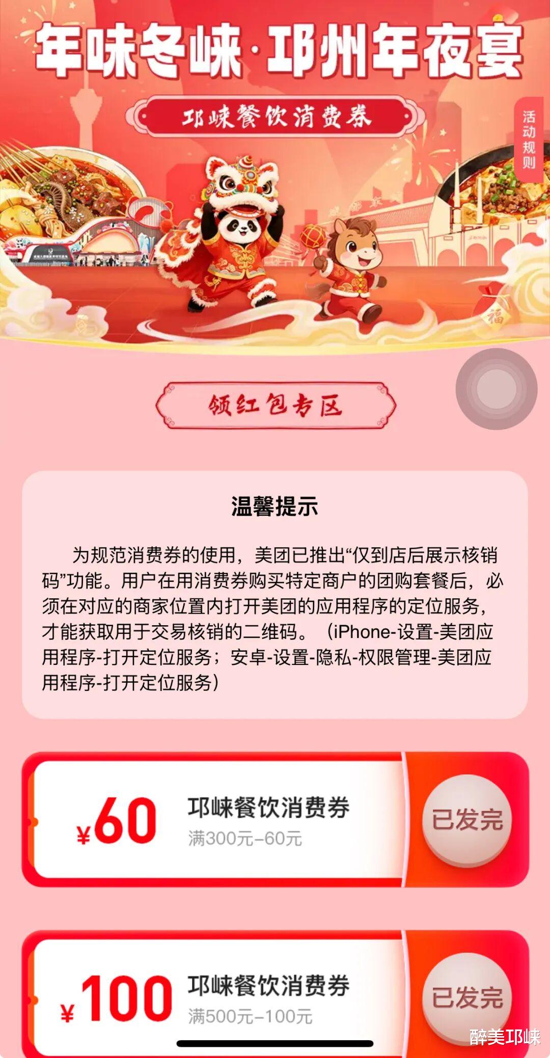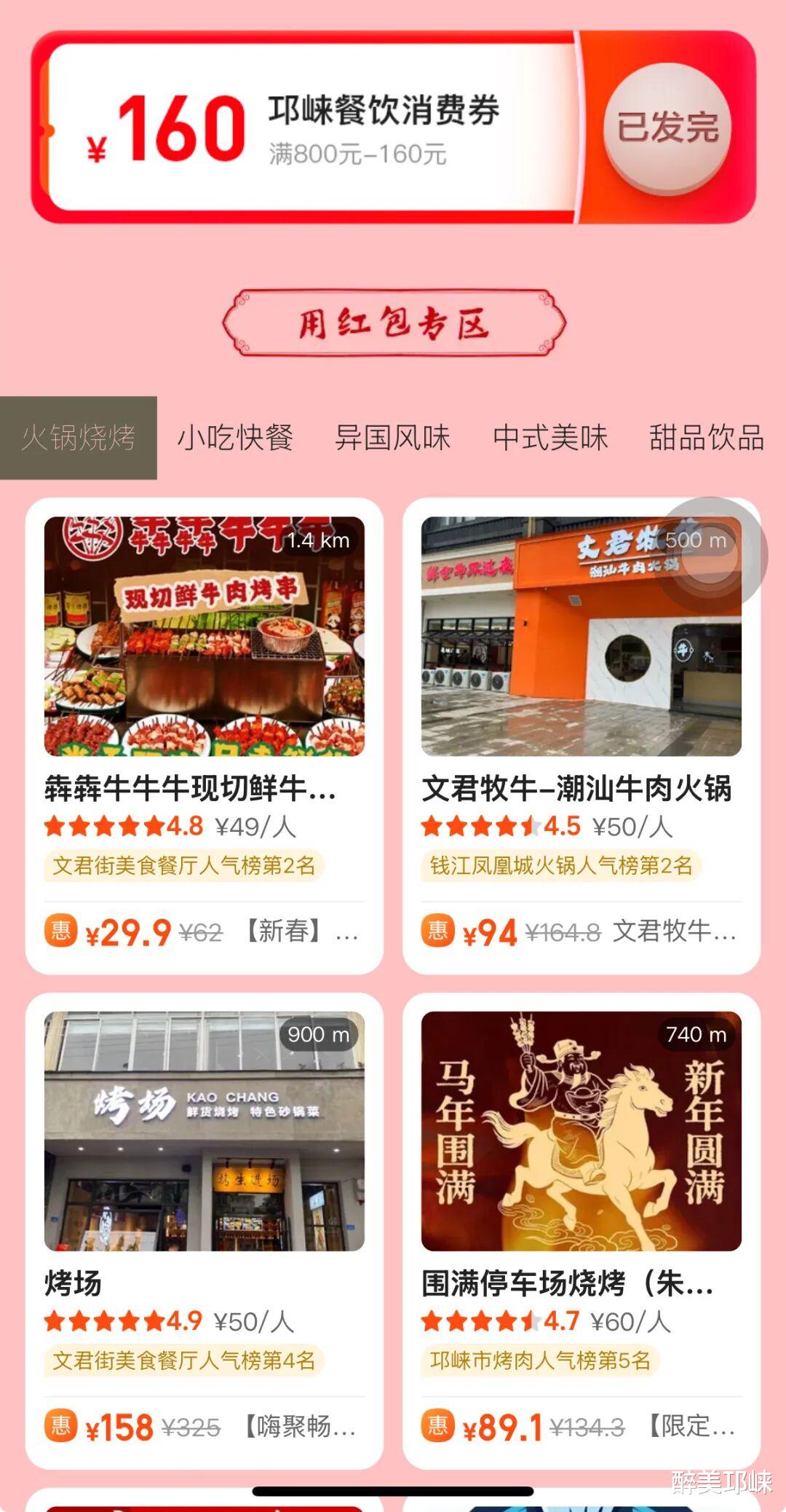 记者从市商务局了解到,为进一步促进春节期间餐饮消费,让邛崃市民在团圆聚餐中享受到实实在在的实惠,我市从2月6日至3月3日,每日10点将在美团APP发放三轮餐饮消费券。该消费券可在全市多家火锅、烧烤、中餐、甜品等餐饮点位使用,市民只需打开美团APP,搜索“邛崃消费券”或“邛崃餐饮消费券”,即可直达活动会场领取,消费券数量有限、先到先得。领取成功后,消费券将自动存入用户账户,市民在购买指定商户的美团团购套餐时,可直接抵扣相应金额,最高可抵扣160元。