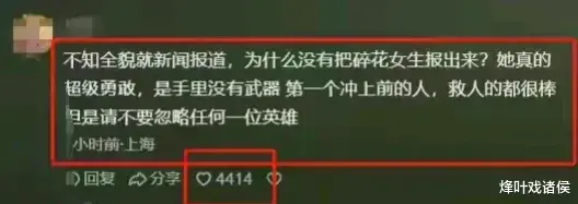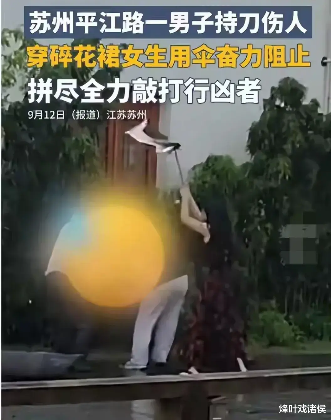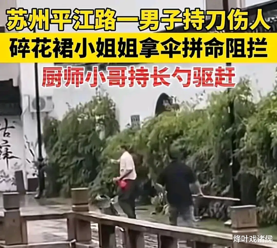 这位拿勺子的黑衣男子固然值得褒奖,但在他出现之前,还有一位穿碎花裙的女子一直在阻止男子行凶。