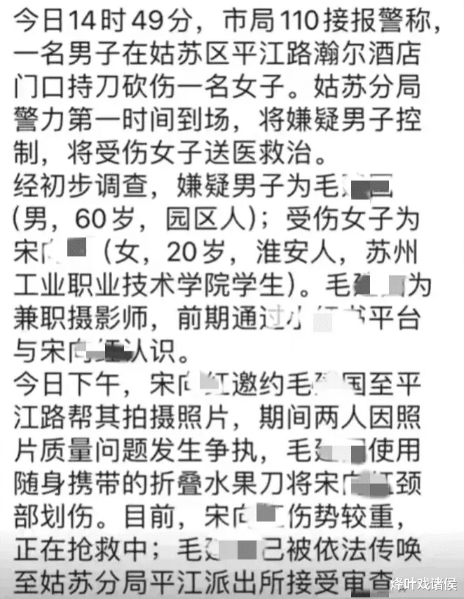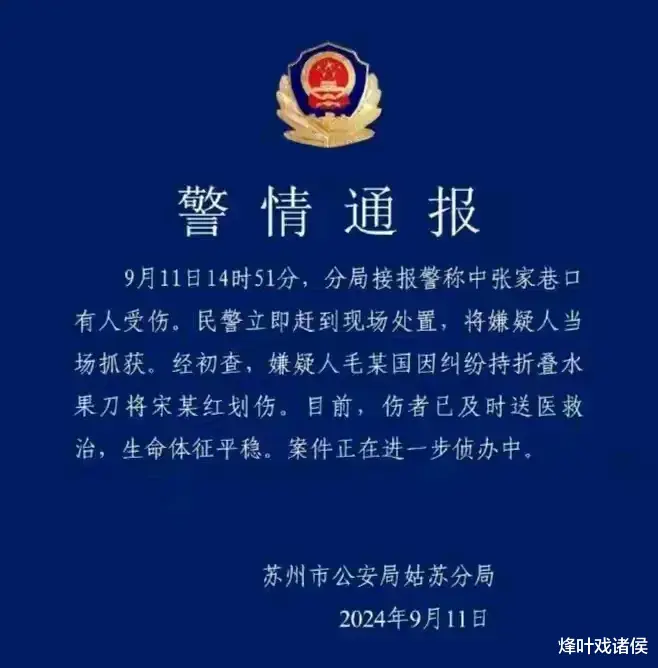 9月11日下午14:51分,当地警局接到了一通报警电话,对方称在苏州的平江街发生了一起持刀伤人案件,已经有人受伤了,热心群众正在和嫌疑人对峙。