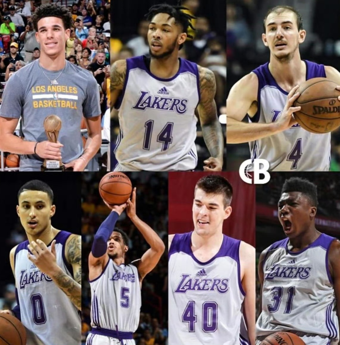 湖人也曾有过高位新秀扎堆的景象,17-18赛季湖人不仅有双榜眼英格拉姆和球哥,还有优质的首轮秀哈特、库兹马、祖巴茨,以及科比退役后重建的第一个前十顺位新人兰德尔。