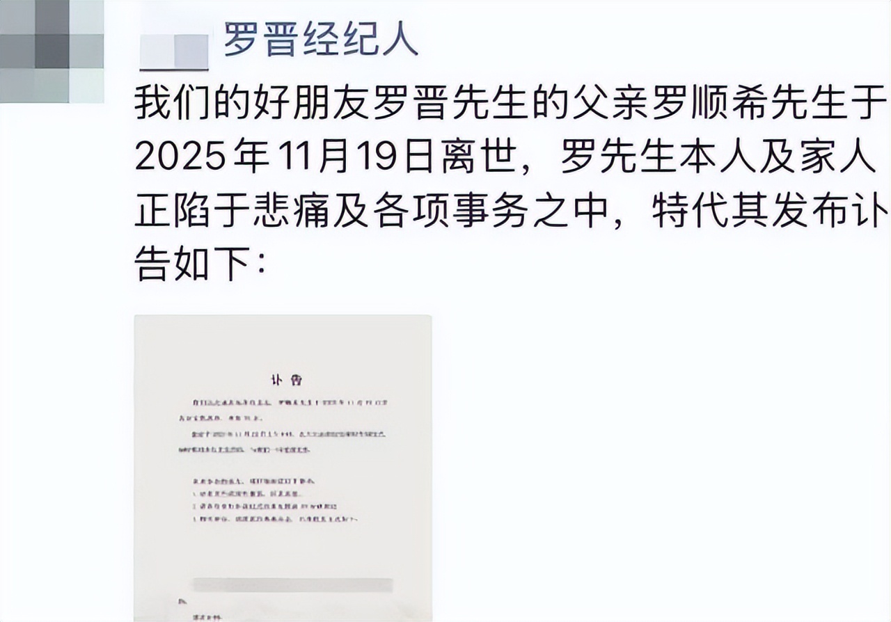 11月21日,罗晋的经纪人在朋友圈发了一条消息,通知圈内好友罗顺希去世的事情。