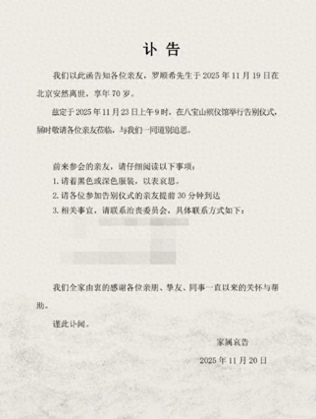 消息发得很简单,只说了老人家在11月19日离世,告别仪式定在23日八宝山举行。