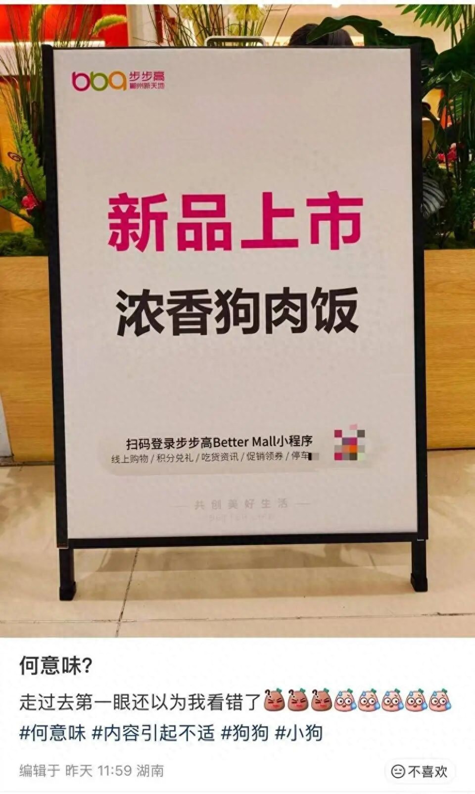 近日,有网友发帖称,湖南郴州市步步高新天地商场内,一家名为“某某某砂锅煲仔饭”的商家在门前立牌上标注新品上市“浓香狗肉饭”。