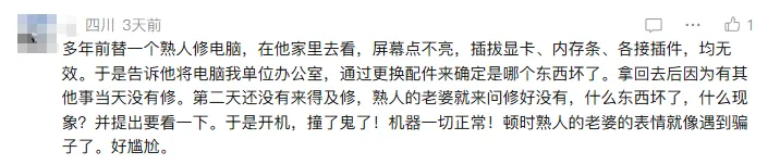 隔天,老铁还没来得及测试维修,这熟人老婆就来办公室了,问电脑是什么状况,哪个配件坏了,有没有修好,并且提出要看一下。结果搞笑了,把主机插电,并连接到显示器之后,按了一下开机键,一切正常。